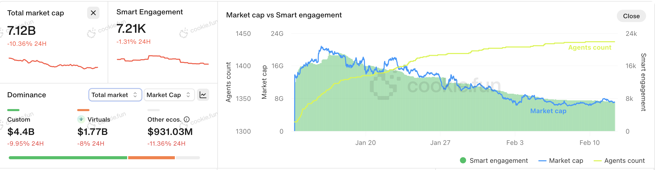 同样,Virtuals Protocol代币VIRTUAL的价格也出现显著回调。根据CoinGecko的数据,过去一个月,VIRTUAL的价格跌幅达46.3%。这一数据下滑趋势与AI Agent赛道整体遇冷有着重要关系。根据Cookie.fun的数据显示,过去一个月,AI代理市场的整体市值已经从高点缩水近65.3%。