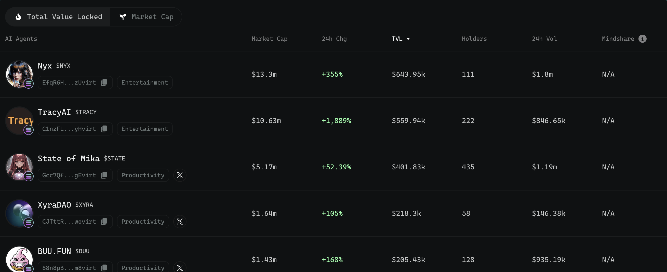 尽管如此,Virtuals Protocol依然在AI代理市场中占据领先地位。Cookie.fun数据显示,Virtuals Protocol的生态市值达到了17.7亿美元,位居市场榜首,占据了整体市场份额的24.8%。然而,由于Virtuals Protocol在Solana上的上线时间较短,Solana上的AI Agent市场仍以ai16z为主,其市场份额接近19.2%。
