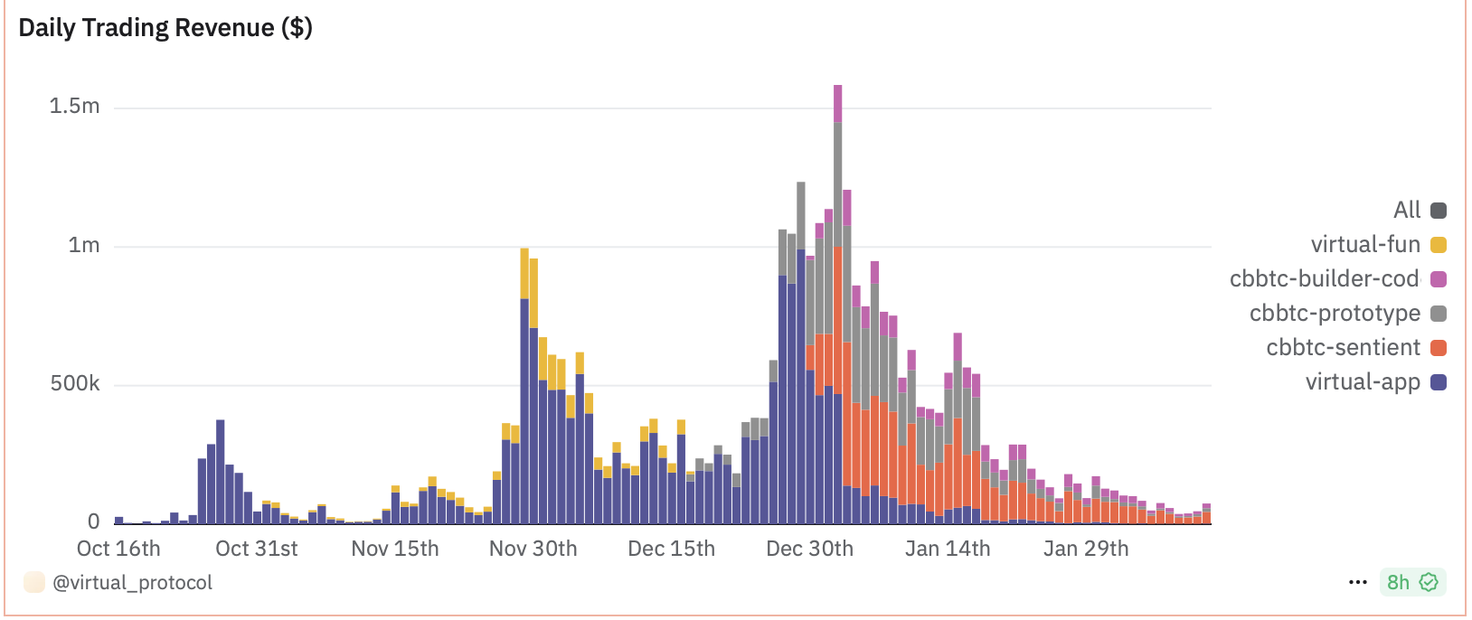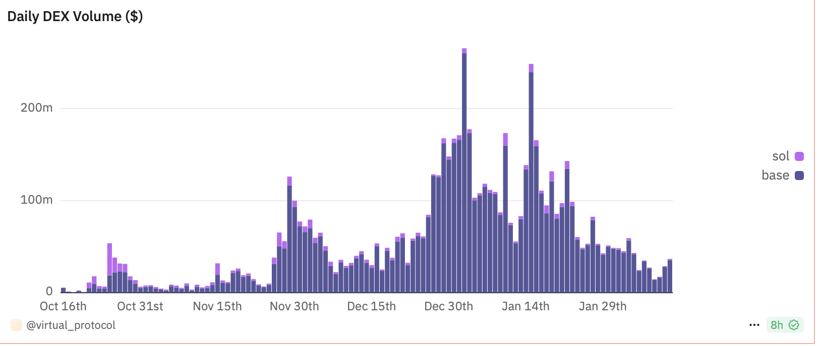 然而,Virtuals Protocol的多项数据呈现出增长放缓,甚至显著下滑的趋势。Dune数据显示,从AI Agent的创建数量来看,自1月下旬以来,日均创建数量大幅下降,多数情况下仅为两位数,远低于去年11月底时超过1300个的峰值。同时,这一期间的收入也出现了明显下滑,日收入大多仅为数十万甚至数万美元,而今年初一度曾突破158万美元。AI Agent在DEX上的交易量也经历了大幅度下滑,从年初时日交易额最高数亿美元的水平,降至如今的千万美元级别。