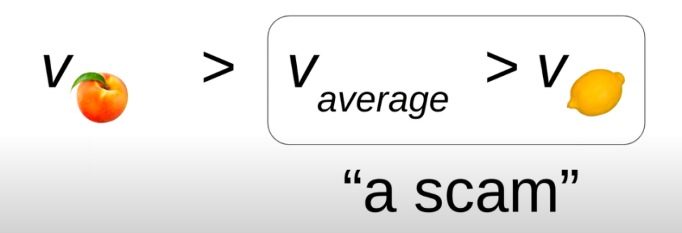 「柠檬问题」基本上是二手车经销商的问题。你去二手车市场,看起来有点像这样,感觉有点骗人的味道,因为你不知道你买的车会是「桃子」还是「柠檬」。这也是当今加密领域的一个大问题——一切看起来都可能是「桃子」,但实际上很多协议都是「柠檬」。