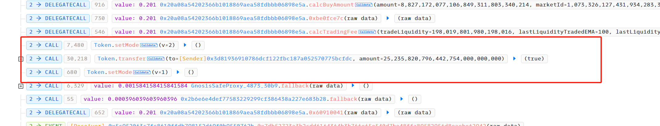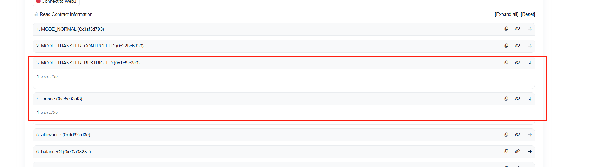 此时,我们可以看到阶段2的 Token 对应的 _mode 为1,也就是 MODE_TRANSFER_RESTRICTED ,限制转账第三方。