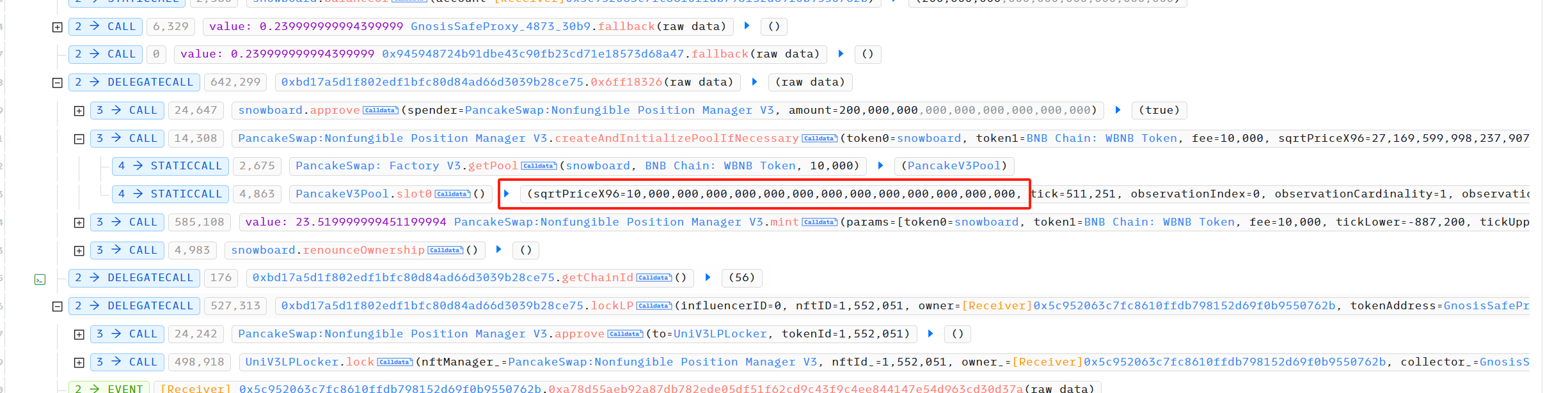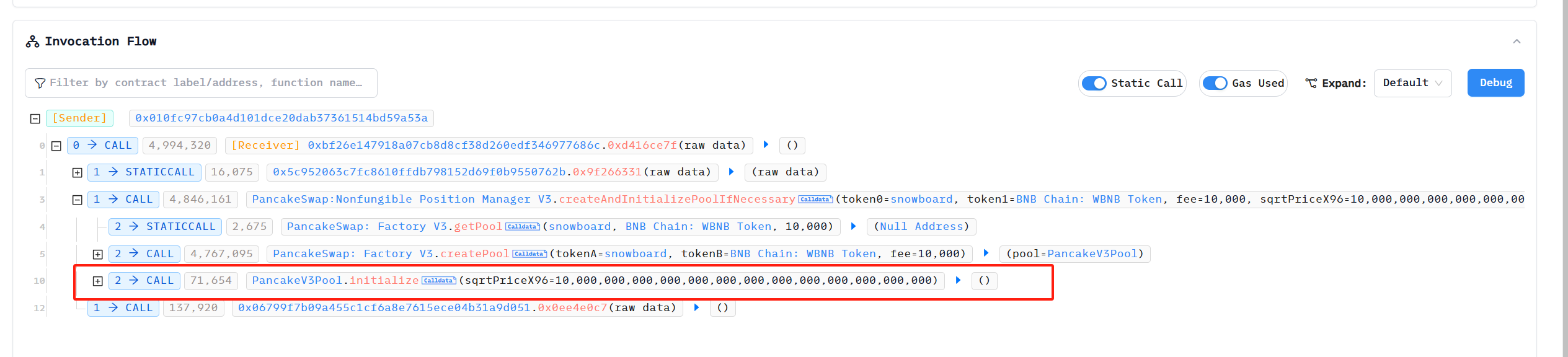 在了解完整个 memecoin 在 four.meme 的生命周期后,我们再来详细看一下攻击流程。首先,攻击者提前创建了一个已经初始化的DEX交易对。并且,将交易对的 sqrtPriceX96 设置为10000000000000000000000000000000000000000 ,比正常值大了 368058418256012 倍。