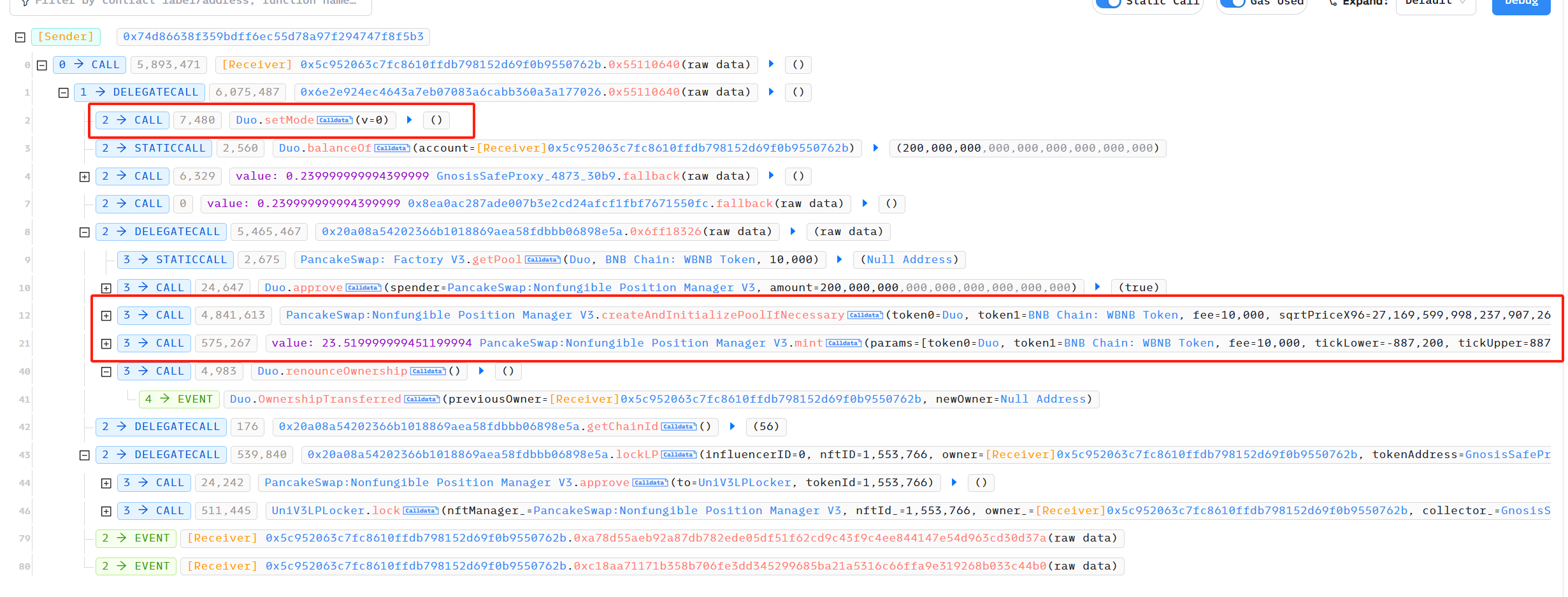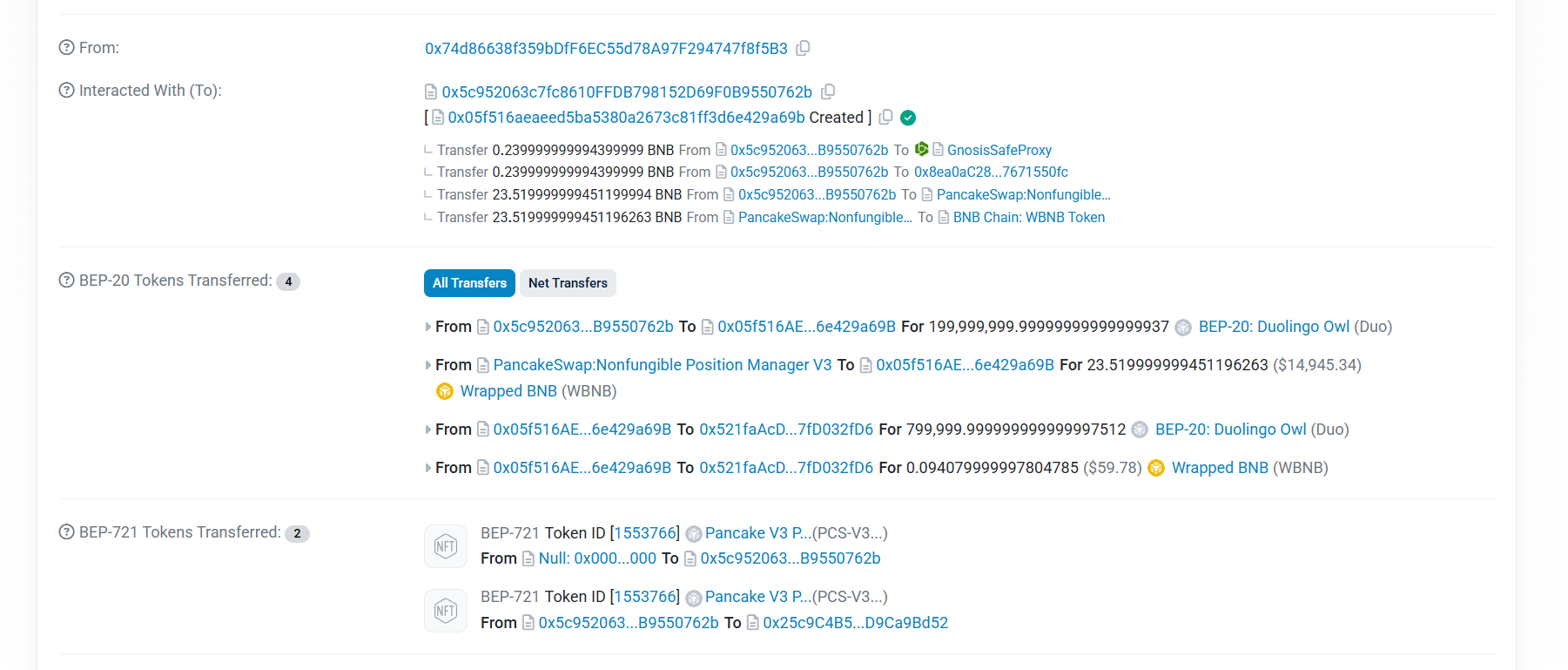 当该 memecoin 的市值到达 24 BNB 时,此时 Bonding Curve Process 达到 100% 。launchpad 官方就会将剩下的 20% memecoin 和 24 BNB 迁移到 DEX PancakeSwap 上。至此,阶段3正式完成。下面的交易就是 launchpad 官方将 memecoin 迁移到 PancakeSwap 上的交易。