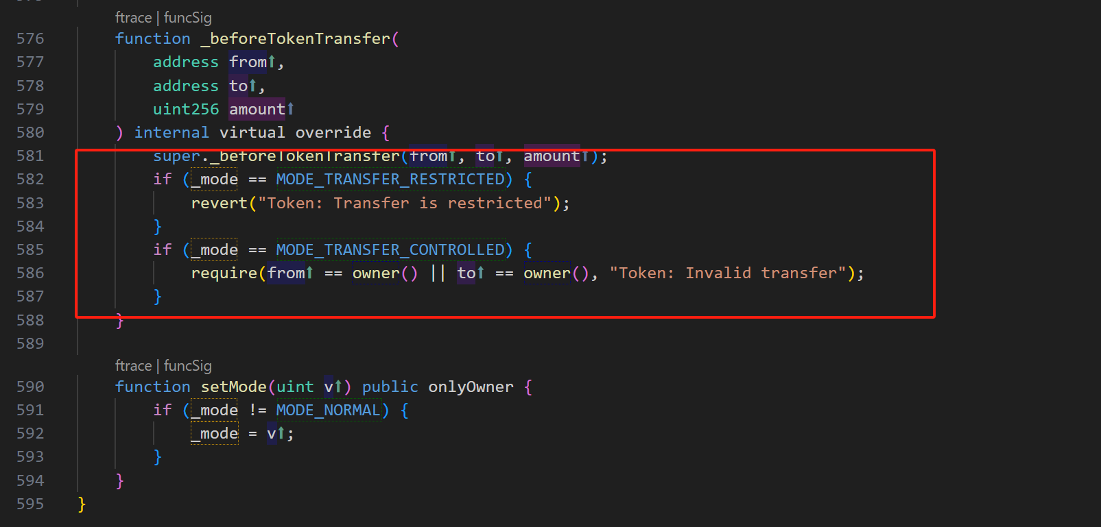 其中在 _beforeTokenTransfer 通过参数 _mode 对转账进行了限制