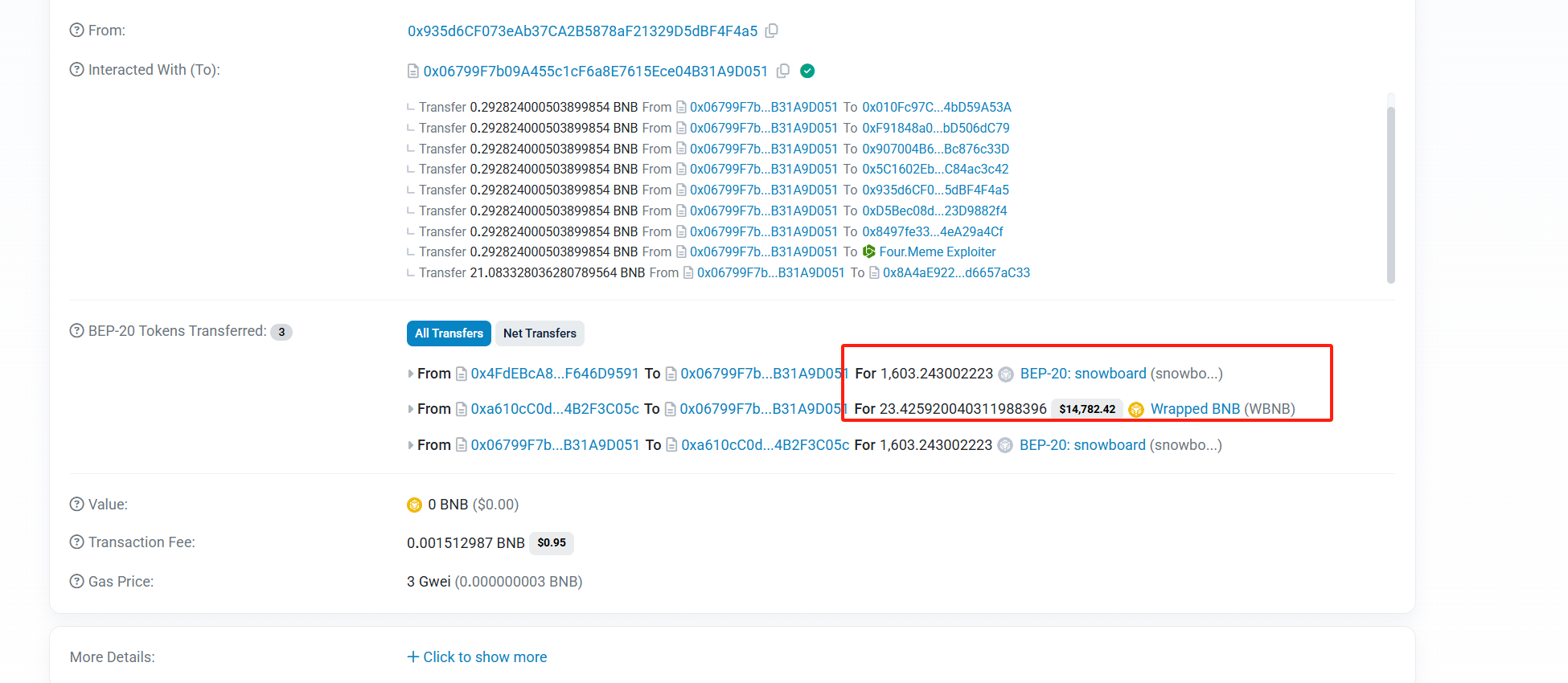 我们监测到平台上的 memecoin snowboard( https://four.meme/token/0x4abfd9a204344bd81a276c075ef89412c9fd2f64 )遭受黑客攻击。损失约 15, 000 USD 。攻击交易为: https://bscscan.com/tx/0x2902f93a0e0e32893b6d5c907ee7bb5dabc459093efa6dbc6e6ba49f85c27f61