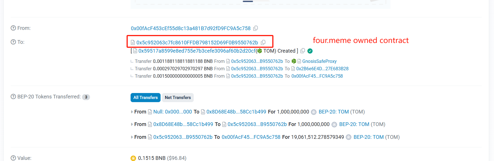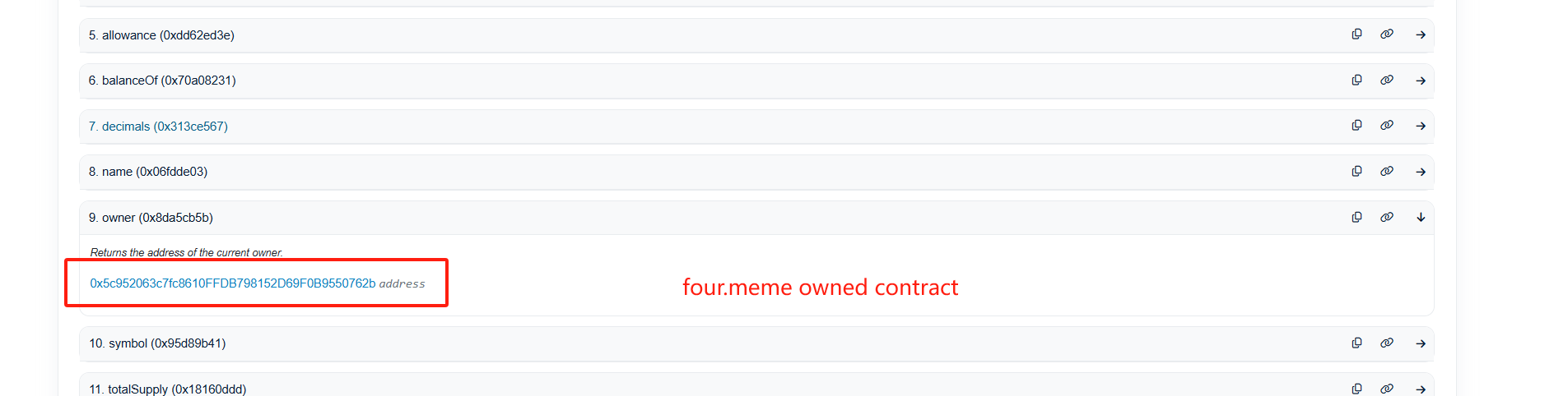 填写完成后,支付手续费便完成 memecoin 的链上合约创建。当然这个合约是由 launchpad 官方的合约创建的,所以创建后的 ERC-20 Token 的 owner 也是 launchpad 官方合约。下面我们可以看一下 four.meme 的一个 memecoin 创建的例子: