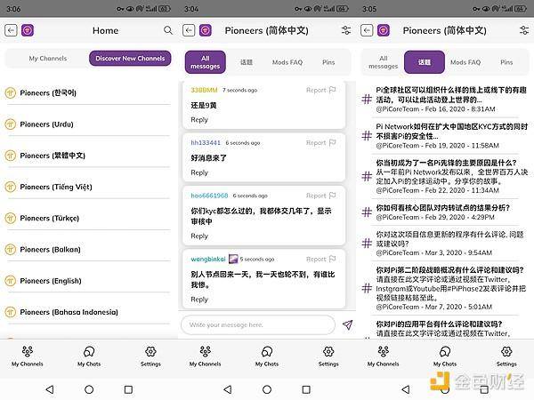 Justin 告诉金色财经记者,这些年一直能看到 PI 在进行着软件的更新,项目方不时更新公告。而在 PI App 内置的聊天群组中,虽然看不到每个聊天空间中具体的人数,但是能感知到 PI 友们的聊天十分活跃。目前,PI APP 内按照语言划分了多个群组。