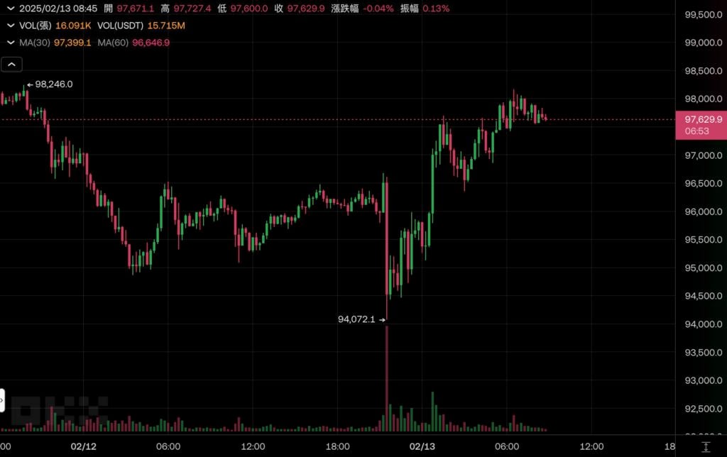 虽然比特币在火热的 CPI 数据出现后一度下杀至 94,072 美元,但可能是市场已经有所预期、加上川普的发言让乌俄𢧐争停火的机会增加,BTC 价格出现快速反弹,清晨六点半更一度突破 9.8 万美元。