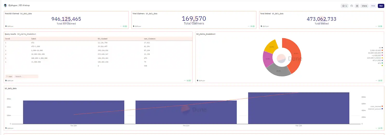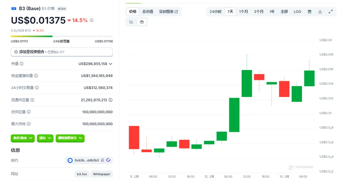 - B3 当前价格 0.014 美元,从 2 月 10 日上线时的低点 0.04 美元,飙到 2 月 12 日的最高点 0.02 元,三天涨了快 400%,比你家楼下煎饼果子涨价速度还快;