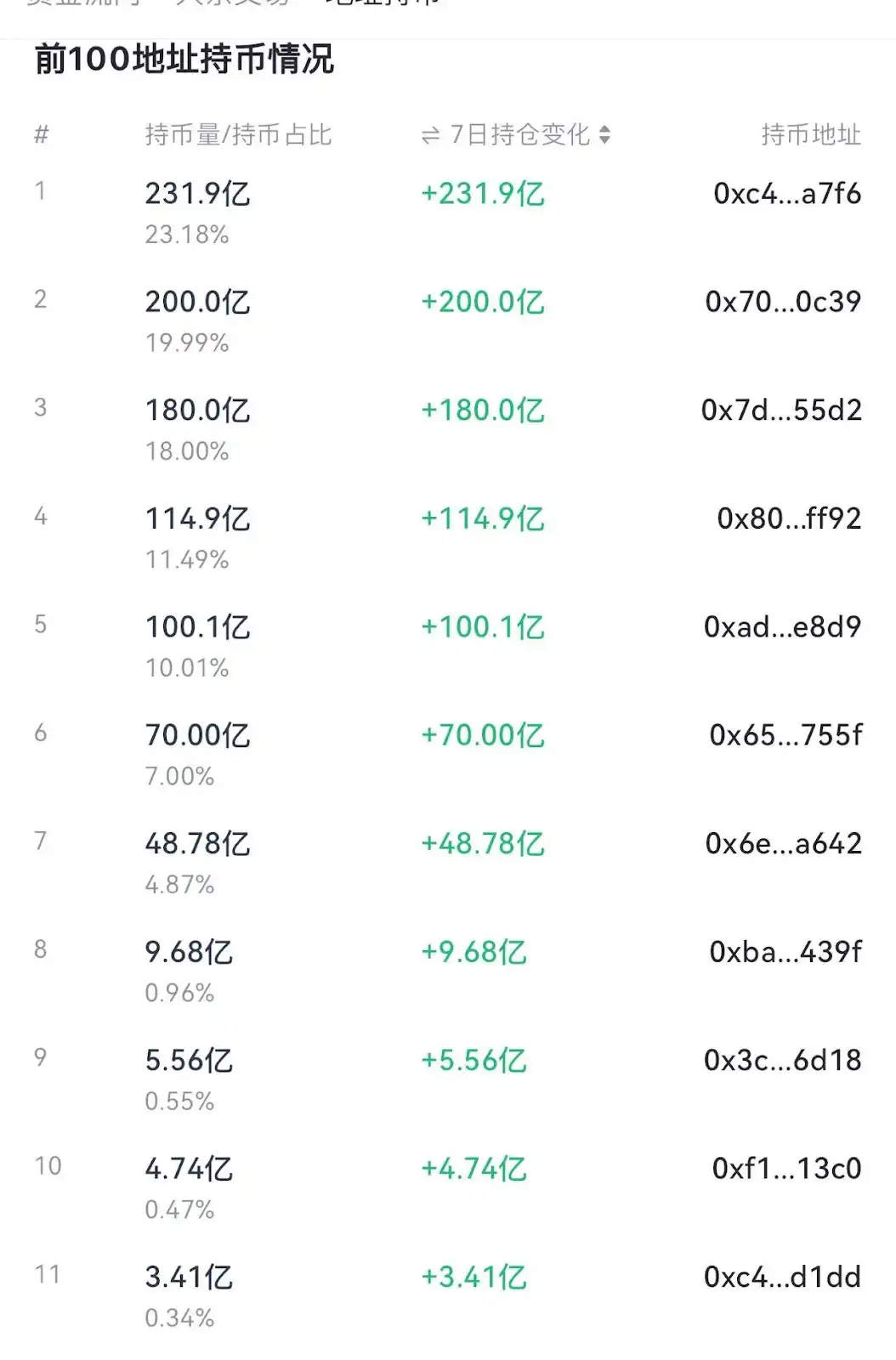 - 前 10 地址扣除掉交易所持有的代币,总计 72%:妥妥的庄家控盘,价格涨跌全看大佬心情;