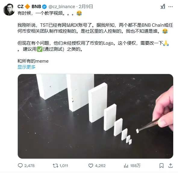 要想溯源这一轮 BNB Chain 热潮,就不得不提到 TST。TST,Test Token,最初不过是一个演示如何在 Four 平台上发行 meme 的视频中用的代币,但视频不经意间暴露了 TST 的合约地址,这让大家敏锐地捕捉到了一丝机会。很快,TST 从一个无人问津的测试币变成了炒作的焦点,TST 的市场关注度迅速攀升。当 CZ 在社交平台上发布声明,澄清 TST 并非币安官方支持的项目时,本该是降温的时刻,没想到反而成为了 TST 再次爆火的催化剂,更让 TST 在社区中更加声名鹊起。在 2 月 6 日,它的市值仅为 50 万美元,CZ 对 TST 代币的回应,使其市值一度突破 5000 万美元。紧接着,2 月 9 日币安宣布上线 TST,TST 市值一路狂飙,突破 5 亿美元,短短 3 天时间涨幅超 100 倍。