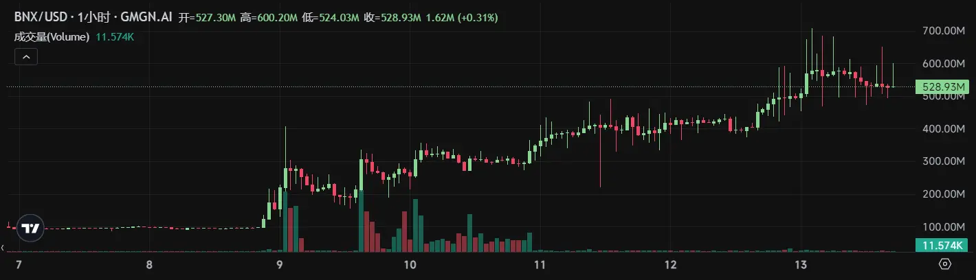 BNX 是 BinaryX 的代币,BinaryX 是一个 Web3 游戏平台,将去中心化金融 (DeFi) 与游戏相结合,允许玩家通过边玩边赚的机制赚取加密货币。其潜力源于 NFT 游戏日益增长的人气,加上强大的社区和创新的游戏玩法,使用户能够在享受沉浸式游戏体验的同时产生现实世界的收入。BNX 从 8 日晚间就呈现比较强劲的上涨趋势,在 4 天内实现了 4 倍左右的涨幅,最高市值一度超过 700M 美元。