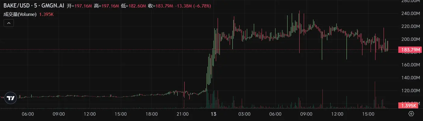 BakerySwap 是一个币安智能链上带有流动性挖矿的自动做市商,BAKE 是平台的原生 BEP-20 治理代币。BakerySwap 是 Uniswap 的迭代,类似 Uniswap 但更快、更便宜。此外,BakerySwap 还有着强大的 NFT 超级市场,包括数字艺术品 NFT、游戏化 NFT 以及最新特色艺术家系列等。Bake 代币于 12 日晚间突然上涨,2 小时内市值从 110M 美元左右上涨至最高 232.48M,涨幅超过 100%。