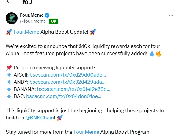 值得一提的是,Four.Meme 官方也对一些优秀的项目给予曝光、流动性支持,因此关注官网的 Alpha Boost 也是筛选优质 meme 标的的一种方法。