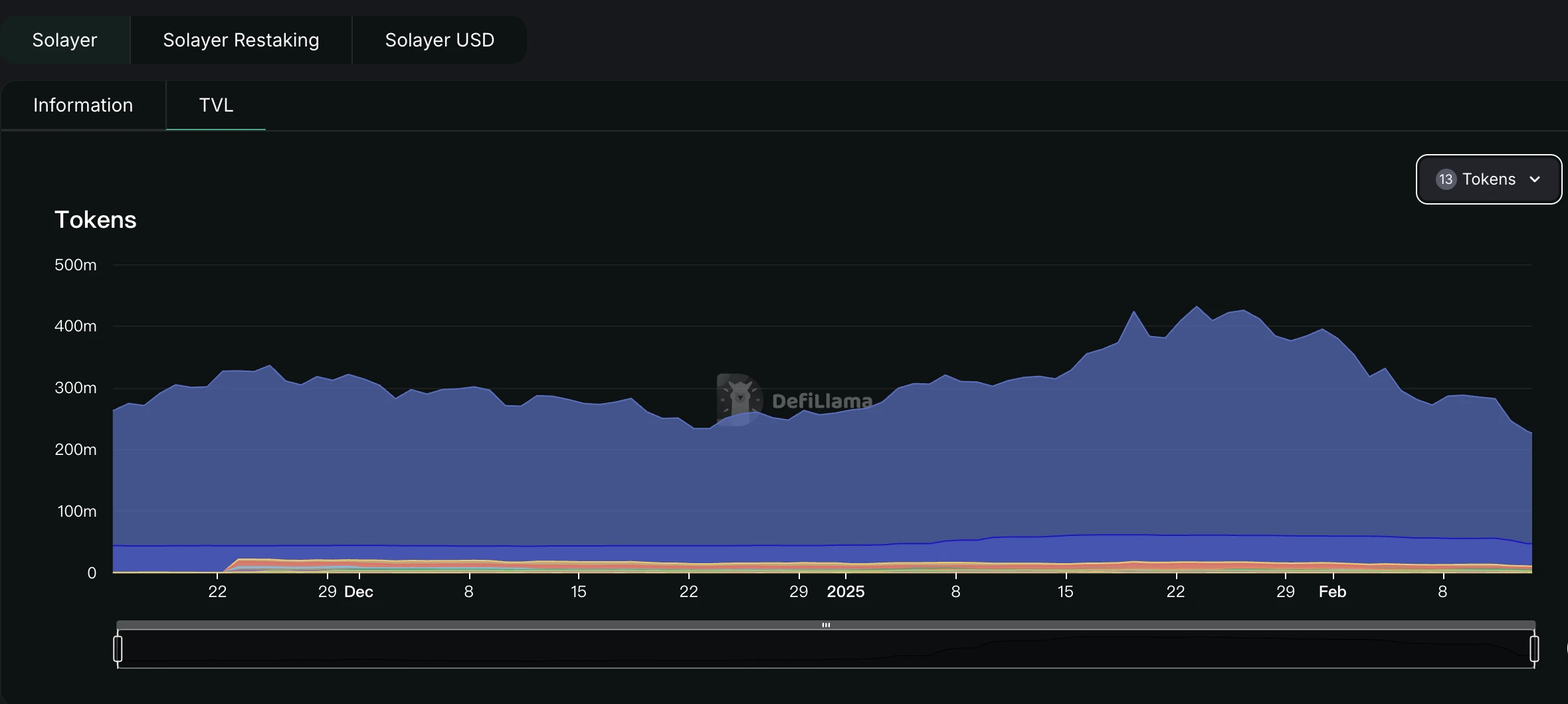 DeFi 数据显示,自 Solayer 于本月开始预热 TGE 及空投以来,该协议 TVL 已出现明显下滑(峰值 216 万 SOL 降至当前 147 万 SOL) —— 显然游资正在狙击下一个类似的空投机会,以利用手中的 SOL 或稳定币赚取更多收益。