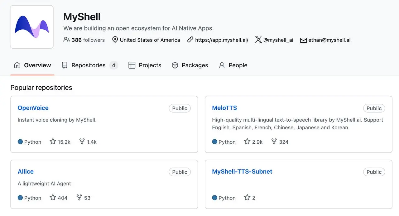 一般来说做个 AI Agent 必然要调用各类已有的大模型和功能,而 Myshell 里已经集成了超过100个主流的开/闭源模型;此外也有多个自研开源的 AI 模型,在项目的 Github 可以看到已经开源的 3 个模型,拥有接近 20K 的收藏。
