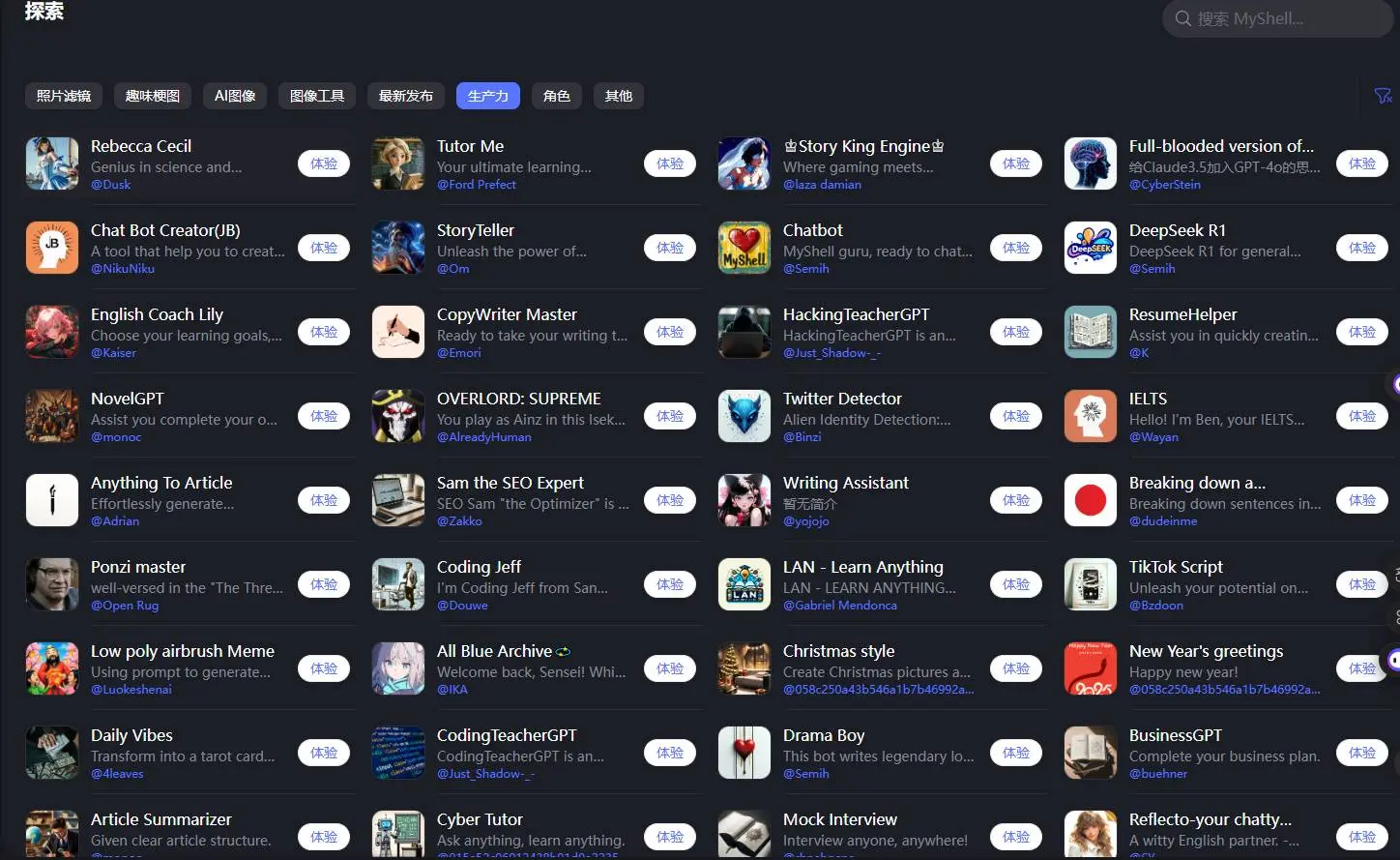 你不光可以和上述的几个主流大模型进行聊天,同样也可以和 Myshell 中其他人创作的 AI Agent 进行对话,而这些 Agent 有自己不同的功能和使用范围。