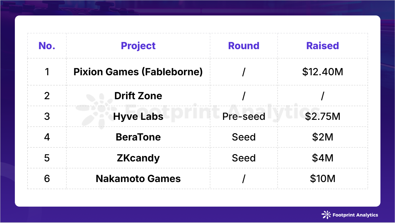 Pixion Games 领衔本月融资活动,在由 Delphi Ventures 领投的战略轮融资中筹集 400 万美元,Spartan Capital、Sky Mavis 和 Animoca Brands 等参投。该工作室的旗舰游戏 Fableborne 将 ARPG 机制与战略性基地建设元素相结合。该游戏在 Ronin 上的成功尤其引人注目。其他值得注意的游戏融资事件包括 Drift Zone、BeraTone 和 Nakamoto Games。