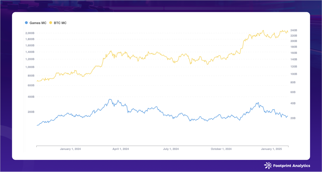 1 月,尽管整体加密市场保持强势,Web3 游戏板块却面临阻力。区块链游戏代币市值从 276 亿美元下降至 223 亿美元,降幅达 19.3%。