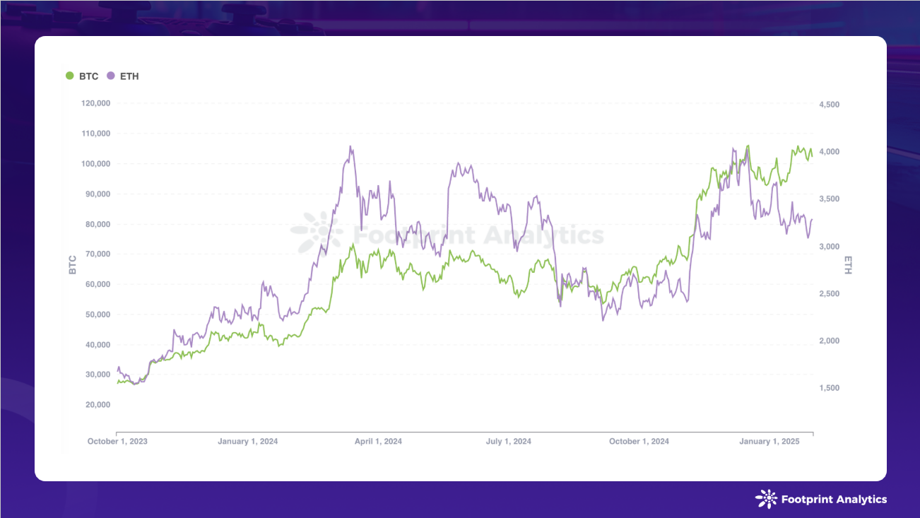 比特币从 94,577 美元上涨至 102,180 美元,涨幅达 8.0%。而以太坊表现疲软,从 3,353 美元下跌至 3,292 美元,跌幅为 1.8%,ETH/BTC 比率创下 2024 年 9 月以来新低。
