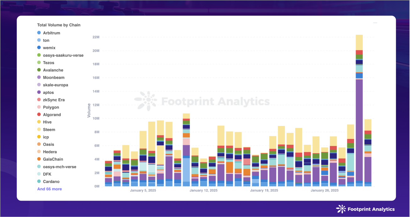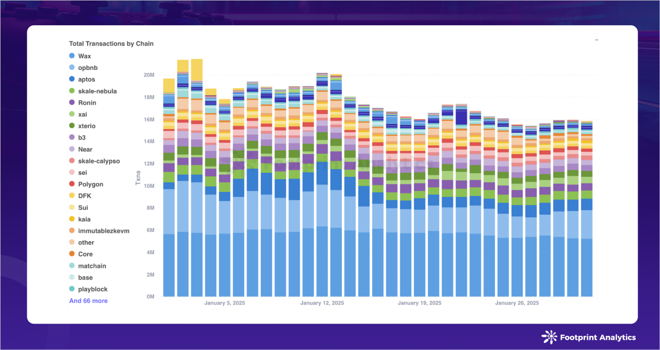 交易活动呈现明显的集中趋势,三条链占据主导地位。WAX 以 1.8 亿笔交易笔数领先,占所有游戏活动的 32.4%。opBNB 以 8,720 万笔交易位居第二 (15.9% 份额),而 Aptos 记录了 3,750 万笔交易 (6.8% 份额)。这三条链共同占据了 1 月份所有游戏交易笔数的 55% 以上。