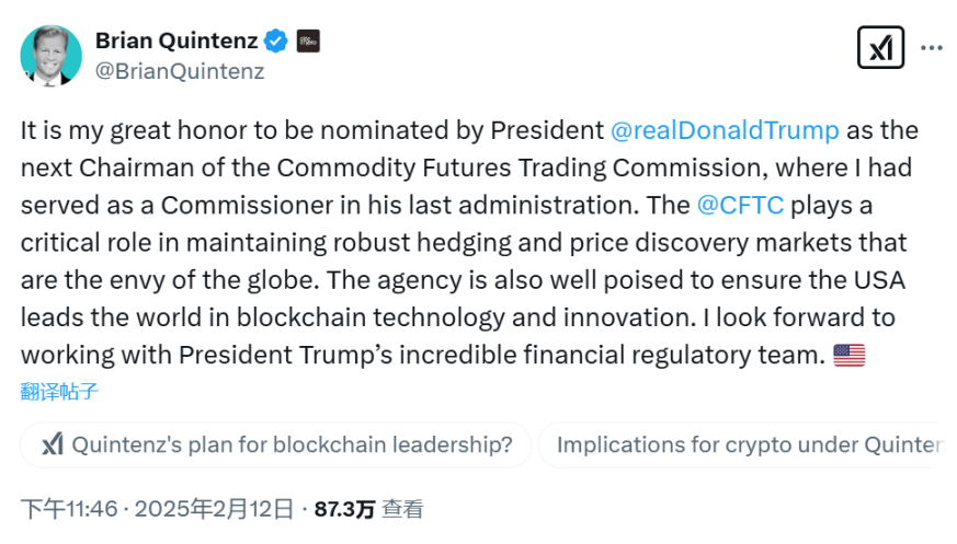 此外,他还提名 a16z 政策负责人 Brian Quintenz 为商品期货交易委员会主席。