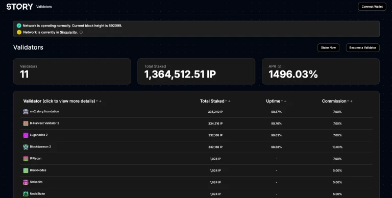 验证者角色(Validator Role):持有者可以 质押 $IP 来保护网络并验证交易,质押越多,获得的奖励也越多。