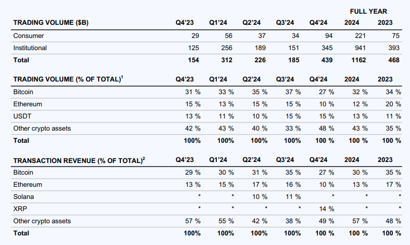2024 全年交易收入为 40 亿美元,同比增长 162%;总交易量为 1.2 万亿美元,同比增长 148%。其中散户交易量为 2210 亿美元,同比增长 195%;机构交易量为 9412 亿美元,同比增长 139%。而在第四季度,Coinbase的交易收入达到 16 亿美元,环比增长 172%;交易量为 4390 亿美元,同比增长 185%。