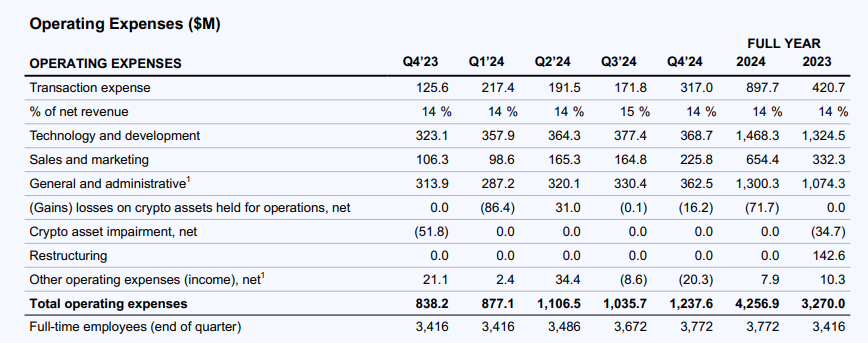2024 年总运营费用为 43 亿美元,同比增长 30% 至 10 亿美元。技术与开发、一般与行政以及销售与营销费用合计同比增长25% 至 6.92 亿美元 。增长主要得益于可变领域支出的增加,尤其是 USDC 奖励支出和营销费用以及更高的股票薪酬和政策支出,因为加大了加密货币宣传力度。年底拥有 3,772 名全职员工,同比增长 10%。