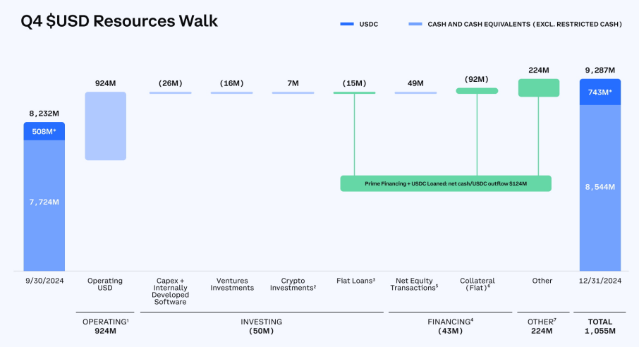 在资本和流动性上,Coinbase第四季度末,美元资源为 93 亿美元,美元资源被定义为现金和现金等价物以及 USDC(扣除作为抵押品借出的或质押的美元)。美元资源环比增长 13% 至 11 亿美元。