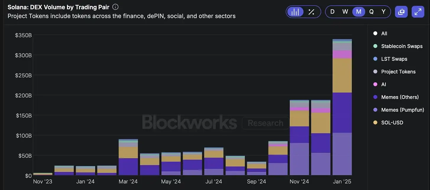 但这只是一个叙事。Solana 的 REV 完全由 Meme 币交易产生,这使得基于未来现金流来评估 SOL 的价值变得困难。而且,Meme 币的主导地位为 Solana 带来了结构性风险。