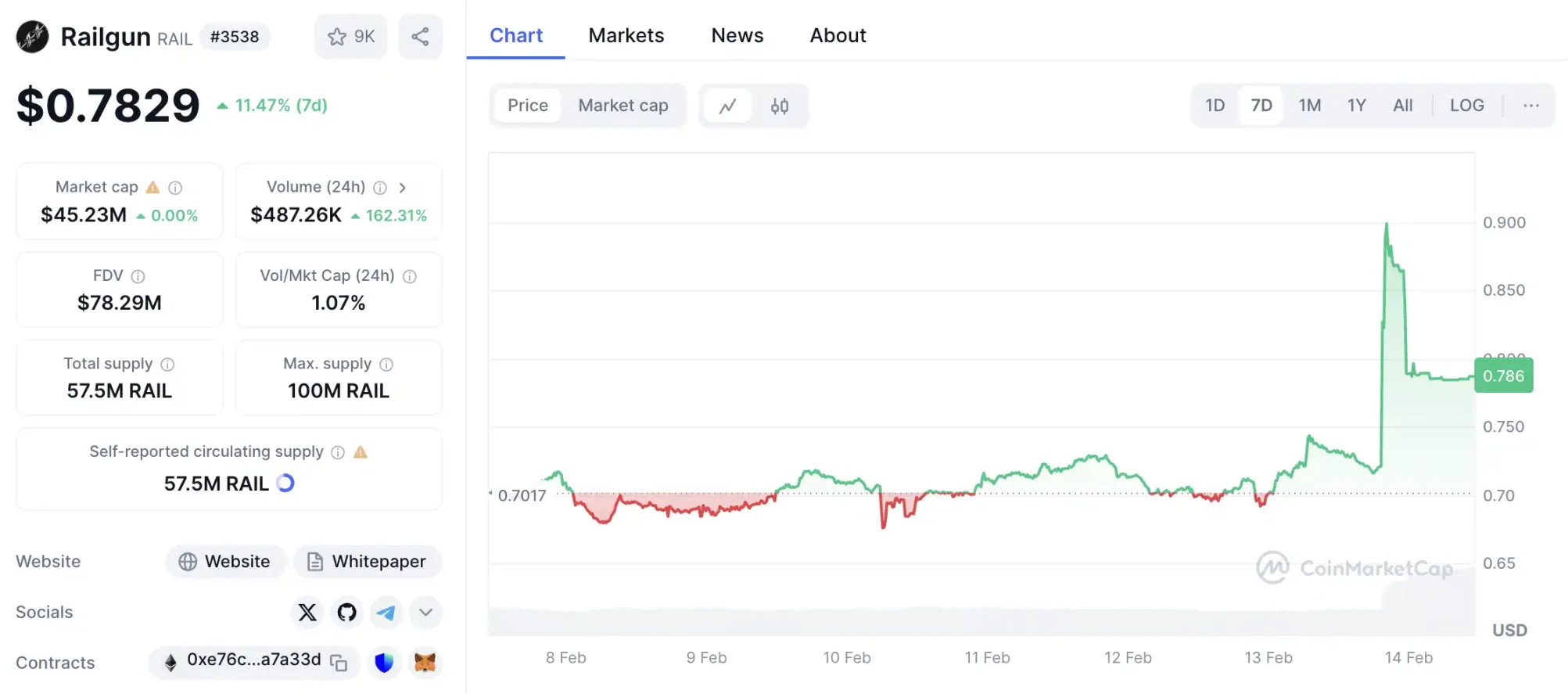 Vitalik 发文之后,市场对该消息的反应十分敏感,Railgun 应声上涨。据行情数据显示,截至发稿,过去 24 小时,Railgun 涨幅为 7.00%,交易量增长 162.31%。