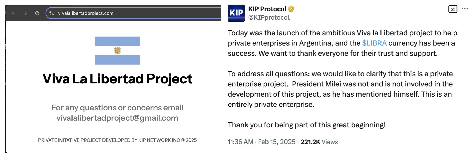 在 LIBRA 归零之际,Web3 AI 基础层 KIP Protocol 发文表示启动了「Viva la Libertad」项目,旨在帮助阿根廷私营企业,LIBRA 取得成功归功于大家的信任与支持。还补充表示了 Milei 总统过去和现在并未参与该项目开发,Viva la Libertad 是由 KIP Protocol 独立开发的私人项目。