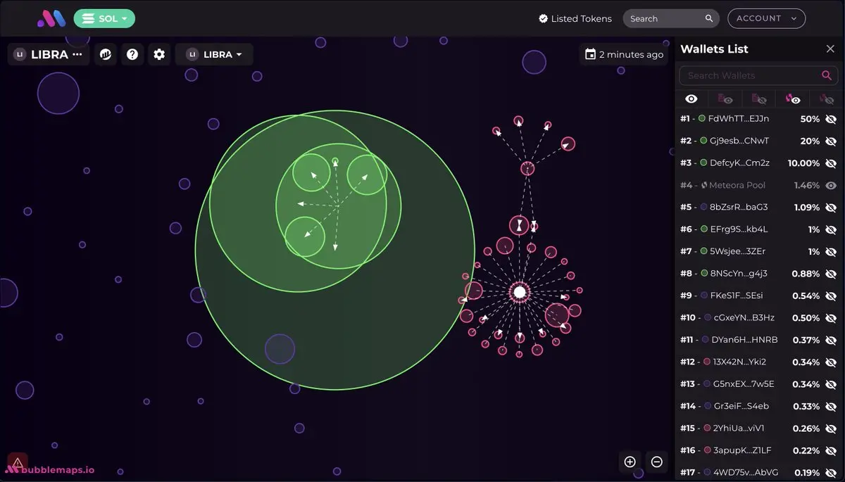早晨 9 时,据 Bubblemaps 分析,LIBRA 发币团队就已经通过多个地址的掏池子行为获利 8700 万余美元。