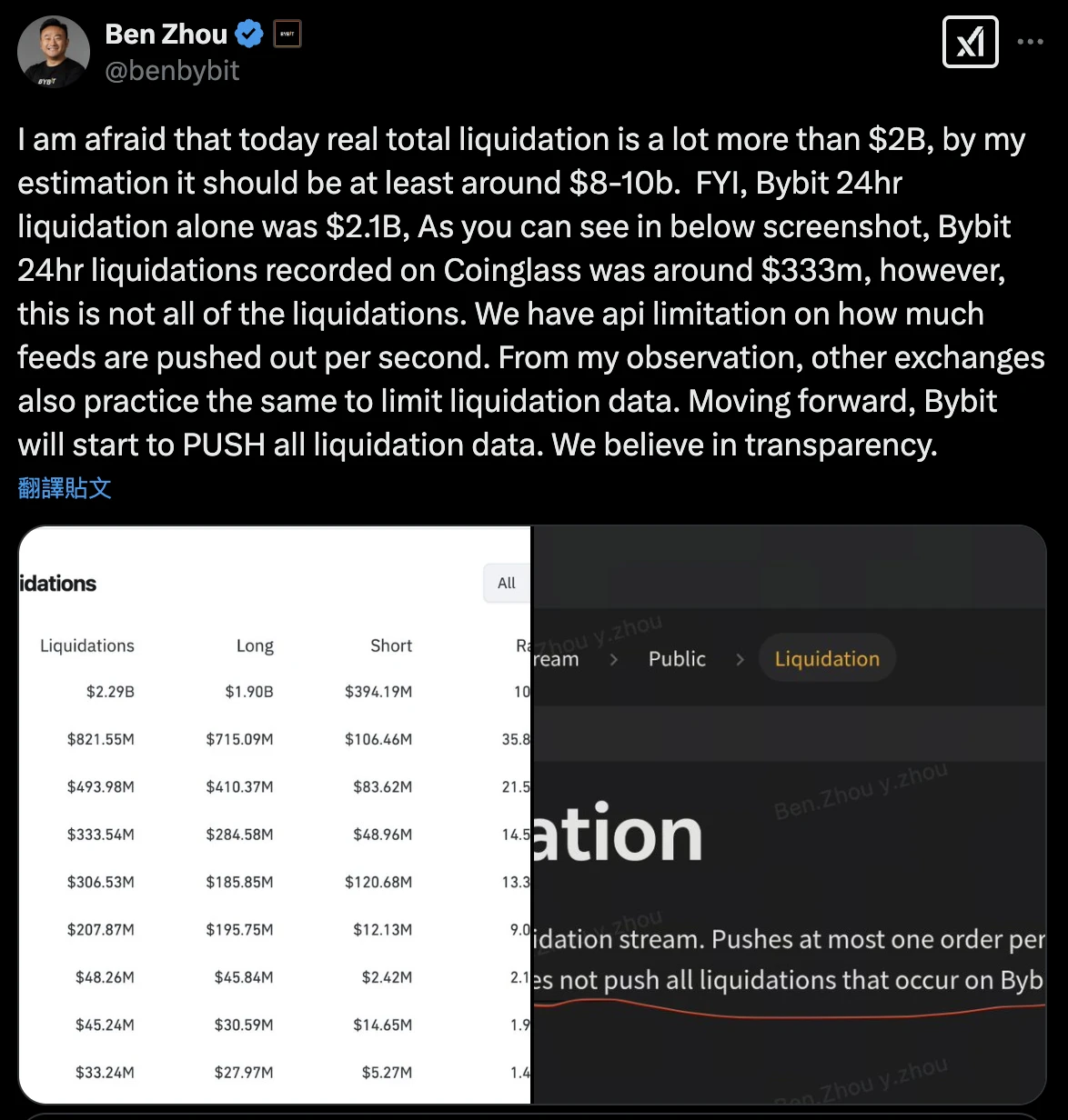 交易所数据显示,此轮爆仓规模存在明显的统计偏差。Coinglass 等第三方平台报告的爆仓金额仅为 23 亿美元,但头部交易所创始人通过内部数据推测实际损失或达 80-100 亿美元。这种差异可能源于交易所 API 的数据推送限制,导致部分强平未被实时捕捉。以 Bybit 为例,其官方披露的爆仓量(21 亿美元)远超 Coinglass 记录的 3.33 亿美元。若按此逻辑推算,本次事件或为加密史上实际爆仓规模最大的衍生品危机。