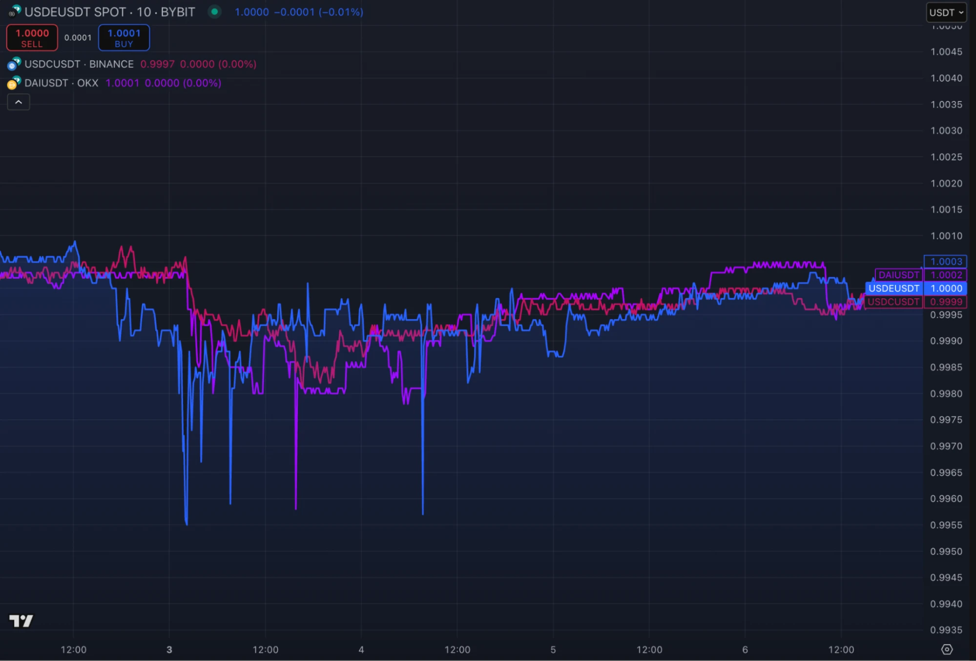 在市场流动性急剧收缩的背景下,用户的目光不得不转向关注稳定币协议锚定表现。令笔者惊讶的是,一些协议通过巧妙的策略,在市场抛售期间获得了额外收益。当多数杠杆玩家在爆仓潮中倒下时,Ethena 的合成美元稳定币 USDe 却完成了一场逆风操作:其 24 小时赎回量达 5000 万美元,二级市场交易额超 3.5 亿美元,与 USDT 的价差始终锚定在± 0.1% 区间。价格曲线显示,USDe 与 USDC、DAI 等法币稳定币走势高度同步,CEX 做市商与链上套利者的协同作用有效抵消了短期流动性冲击。