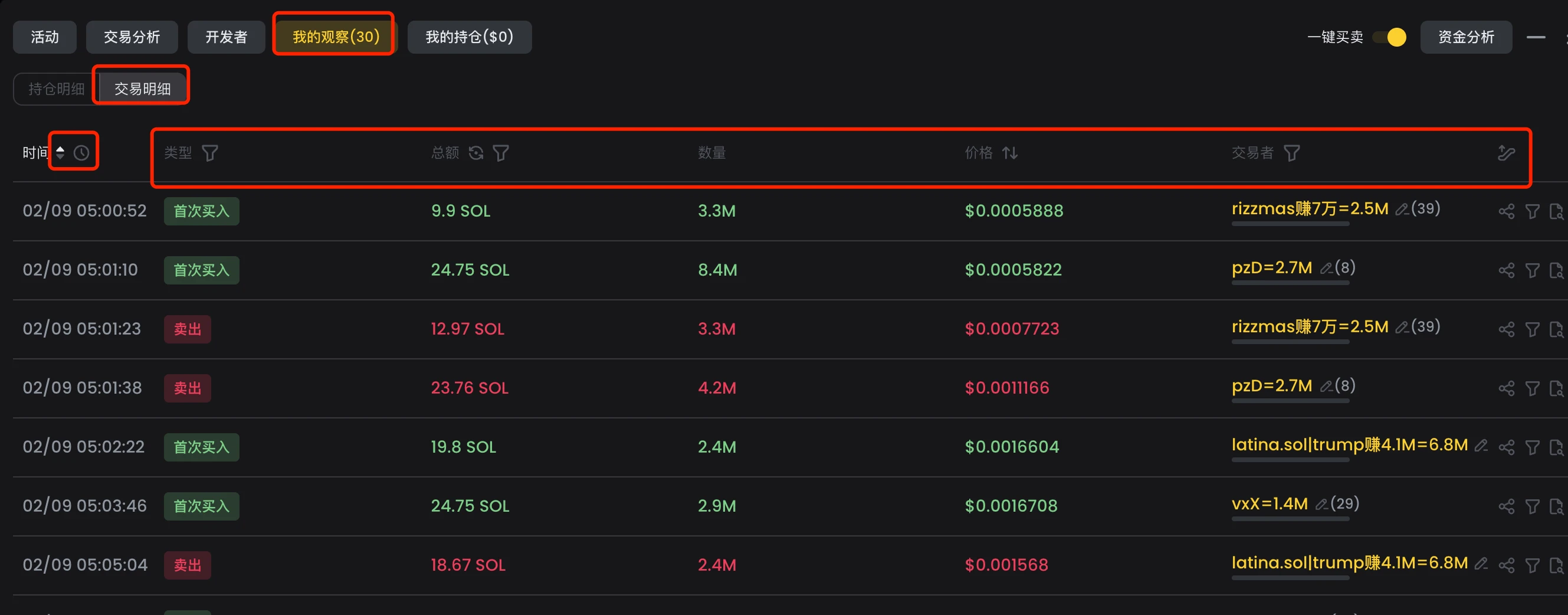 【交易明细】是对交易这个币的所有聪明钱的每笔交易记录按时间顺序列出来,可以正序,也可以倒序。这样当我们想知道自己的聪明钱中哪个地址最先买入这个币,我们就可以按正序排序,第一笔交易就是,这个功能非常实用,可以筛选出消息最快的聪明钱。