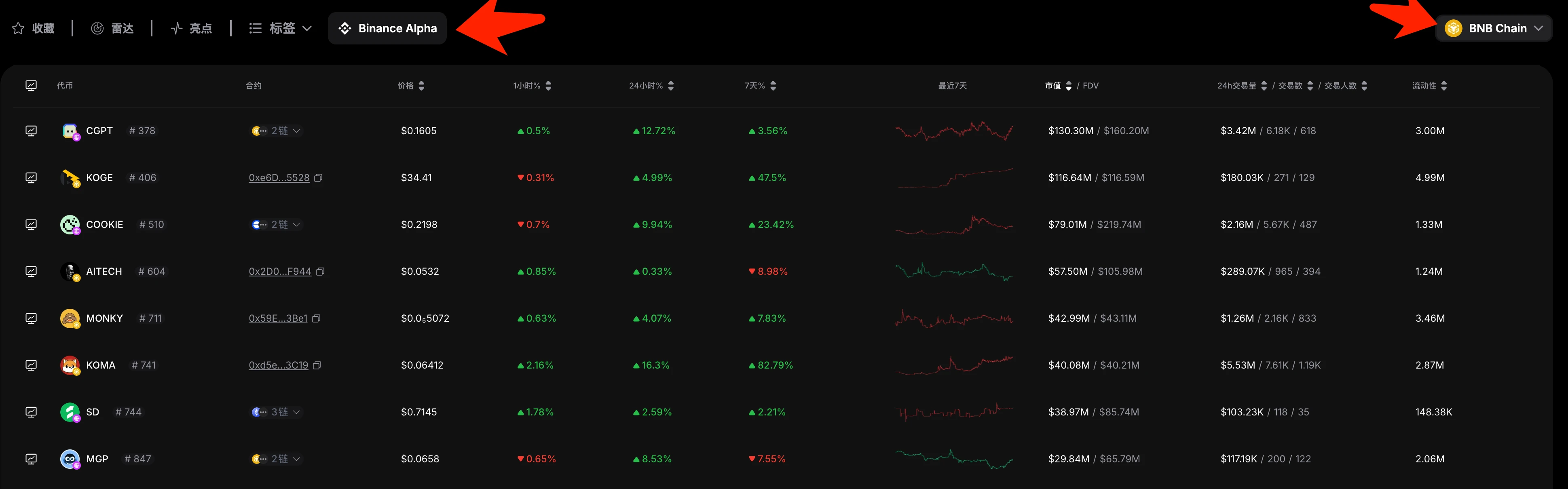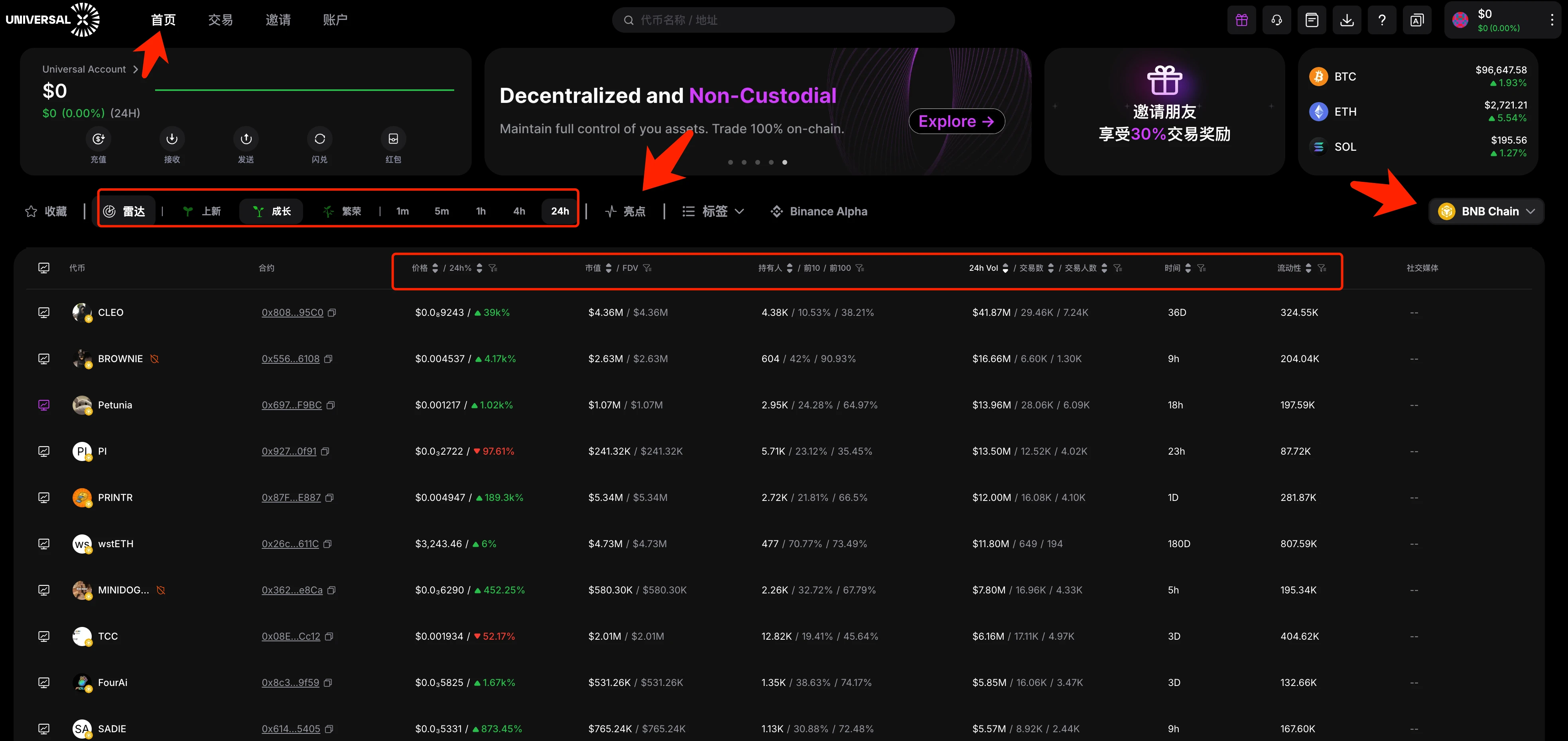 在 UniversalX 的首页,选中【BNB Chain】在【雷达】部分按“上新”、“成长”、“繁荣”可以选择不同时期的币。主要过滤指标是市值、持有人、交易额、流动性。