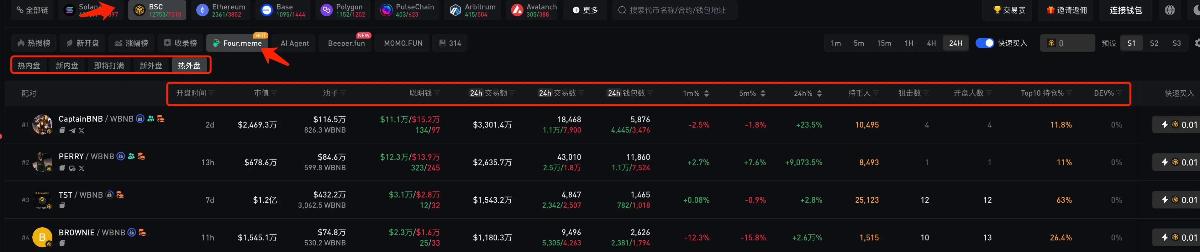 BSC 上的 pump 平台是https://four.meme/,我们可以在【Board】页面查看内盘的币,可以按条件进行各种筛选;也可以在【Ranking】页面查看市值榜单和 24 小时交易量榜。