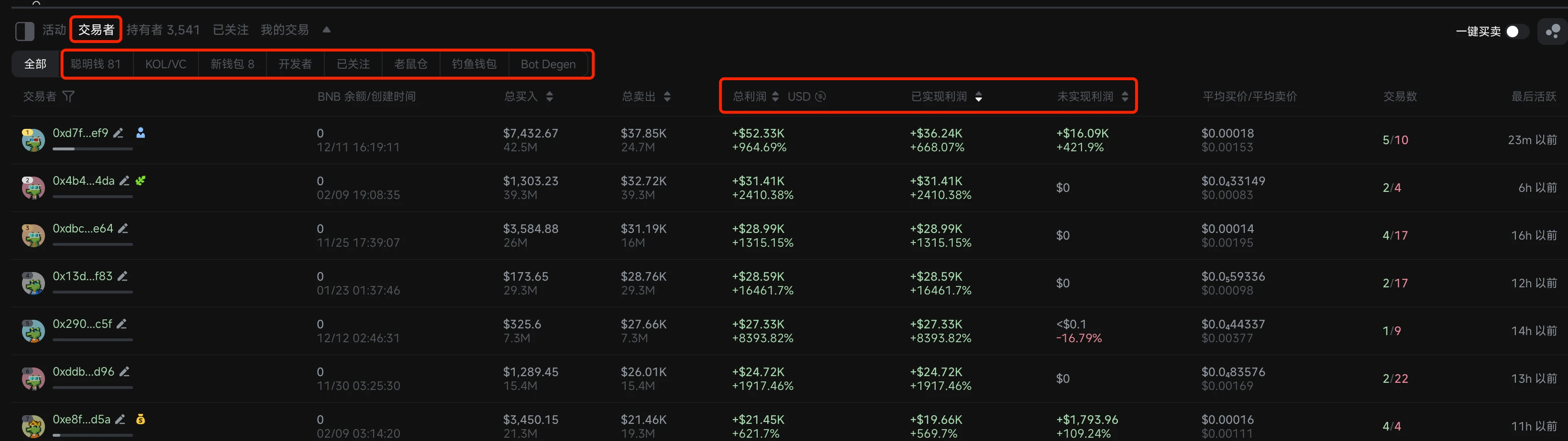 【交易者】是 Top 100 最赚钱地址的列表,其中又按“聪明钱”、“KOL/VC”、“新钱包”、“开发者”、“老鼠仓”、“钓鱼钱包”、“Bot Degen”进行分类。我们可以按“总利润”、“已实现利润”、“未实现利润”等指标进行排序,筛选符合自己标准的聪明钱。