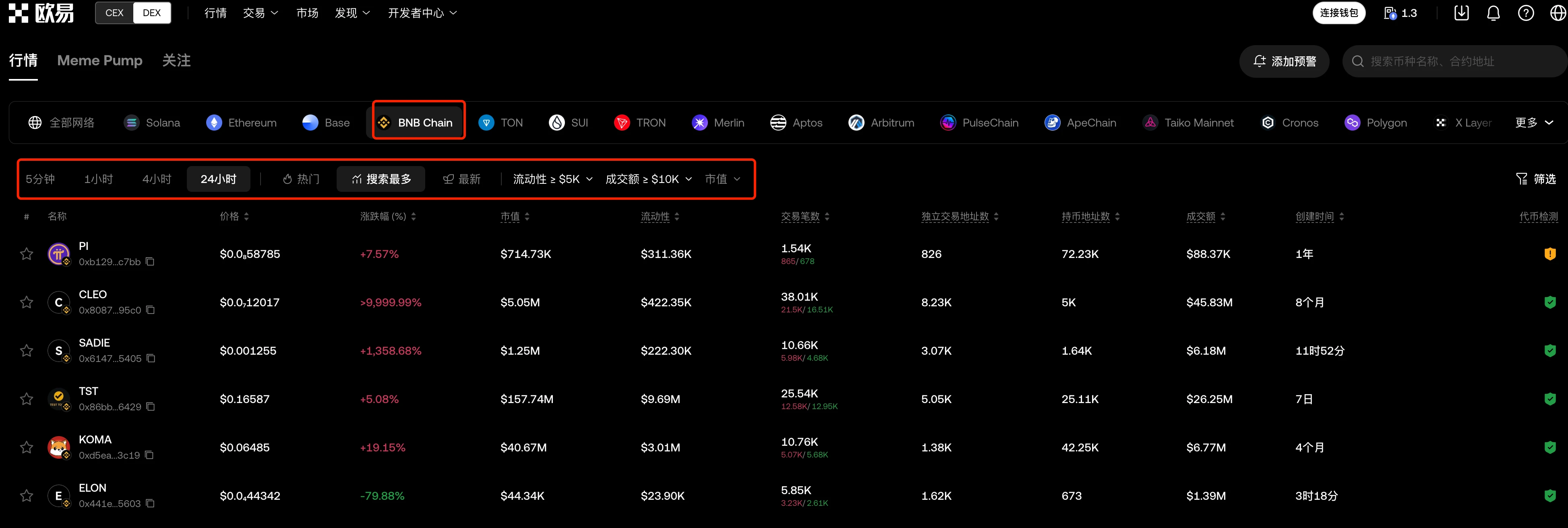 okx 做的比较全,各种链都支持,BSC 链也有。网页端相比Web3钱包功能丰富些,可以根据时间、热门、搜索最多、最新都指标进行筛选。