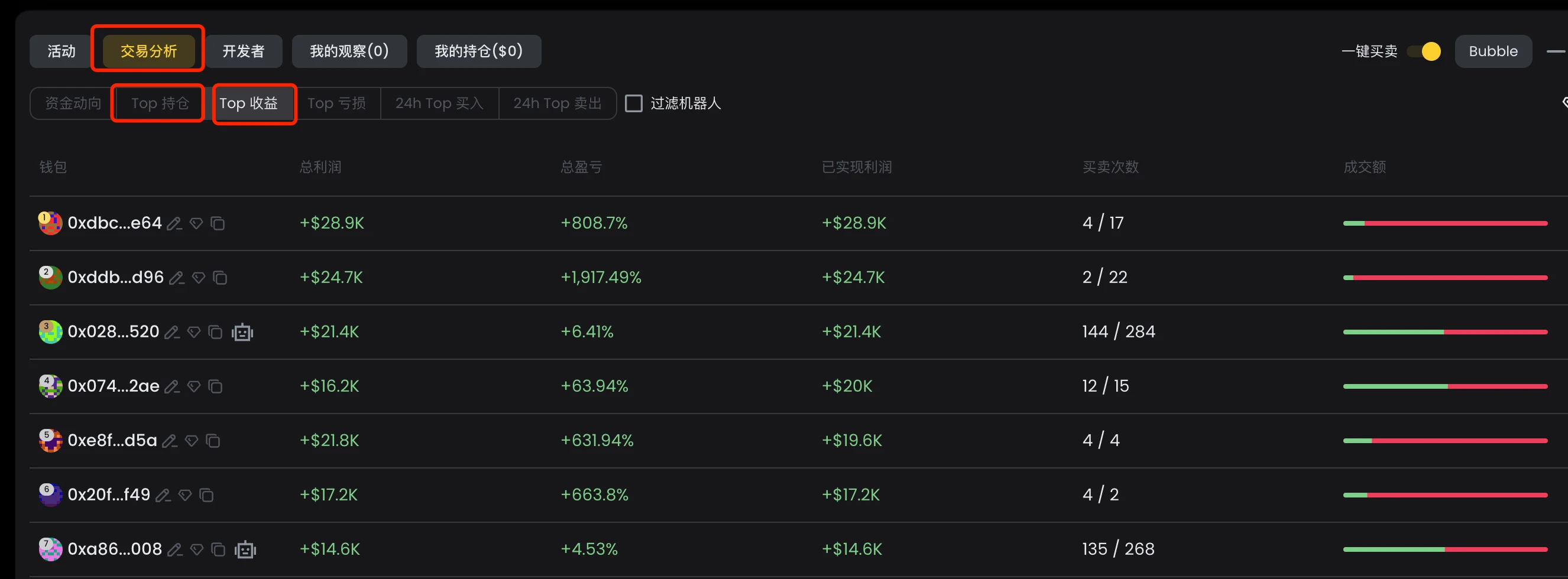 在 debot 中输入想分析币的 CA,打开最下面的【交易分析】,我们重点关注【Top 持仓】和【Top 收益】两部分。其中