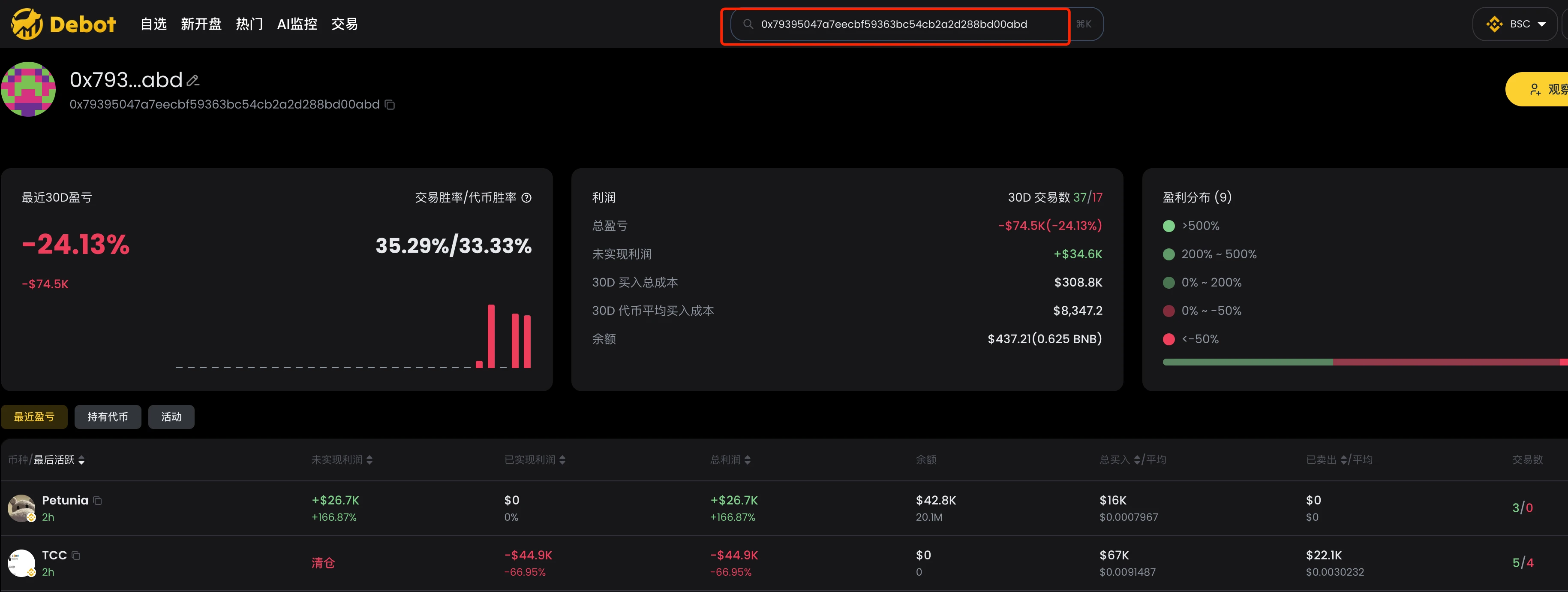 我们如果想看一个地址的总体盈利数据、最近盈亏、持有代币、最近交易记录,也可以把此地址输入到搜索框中,即可以看到详细数据。