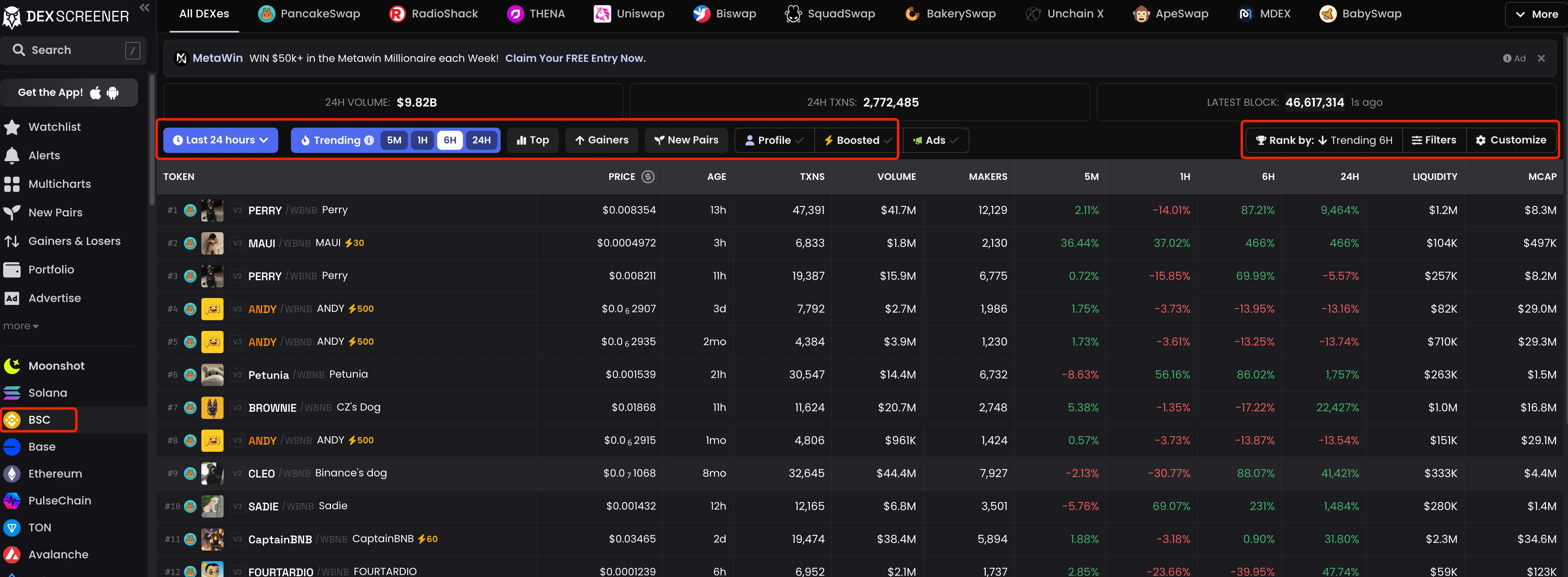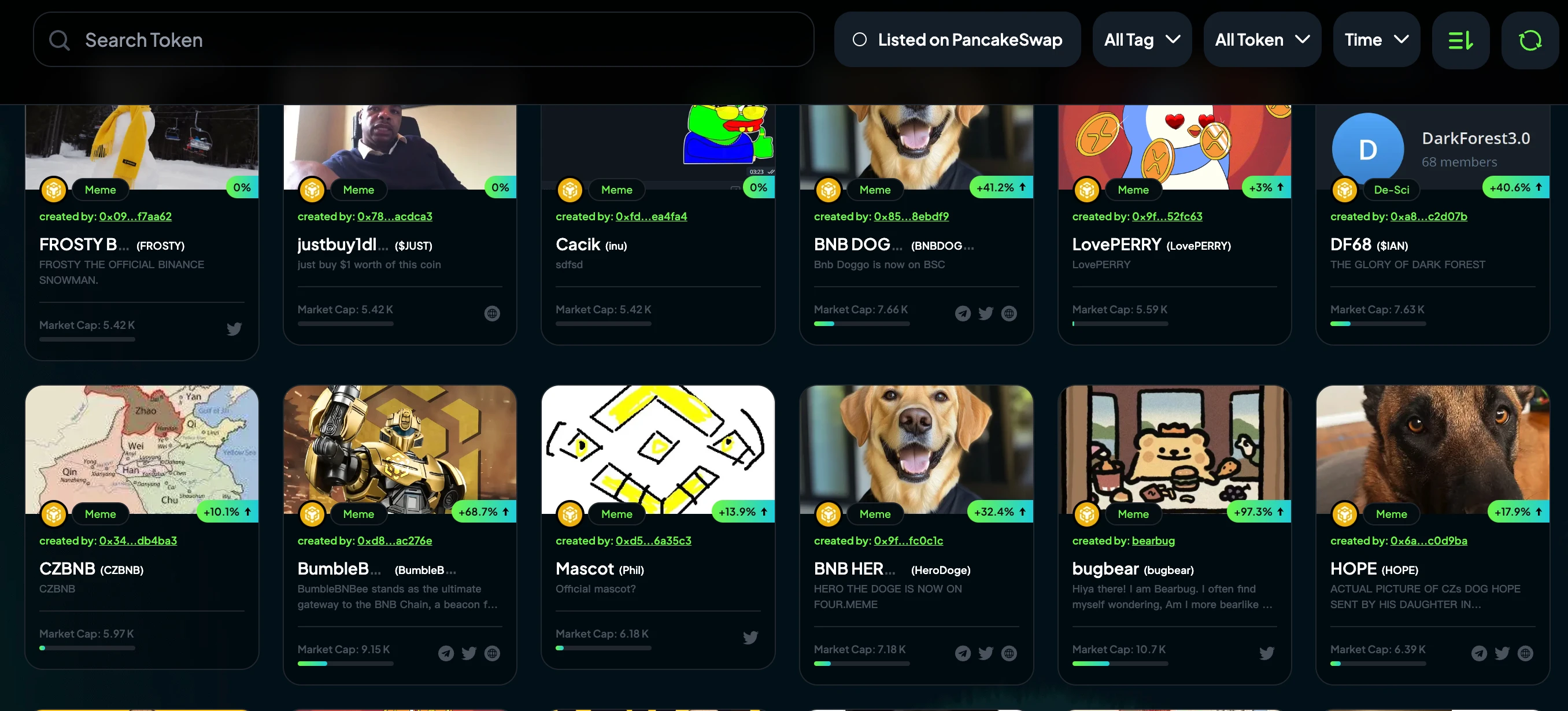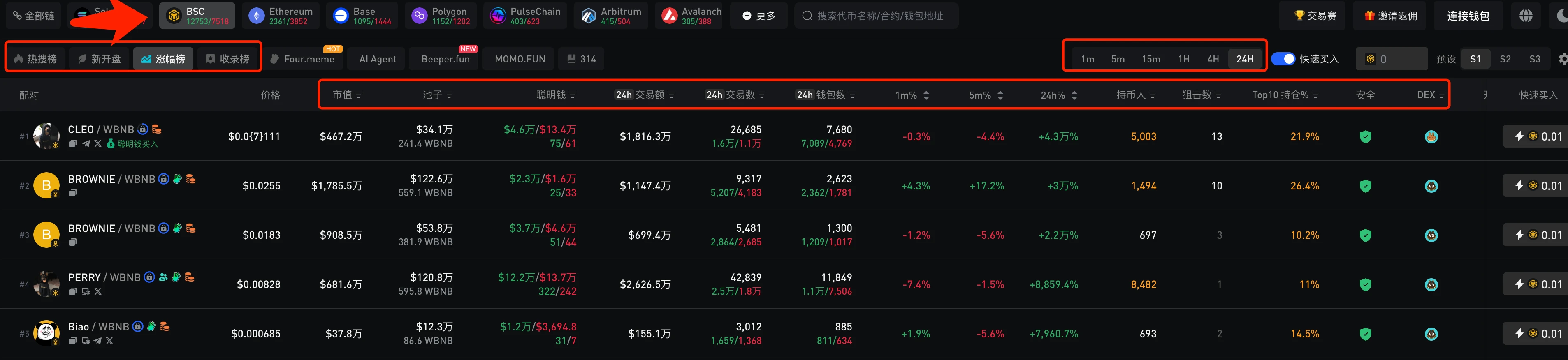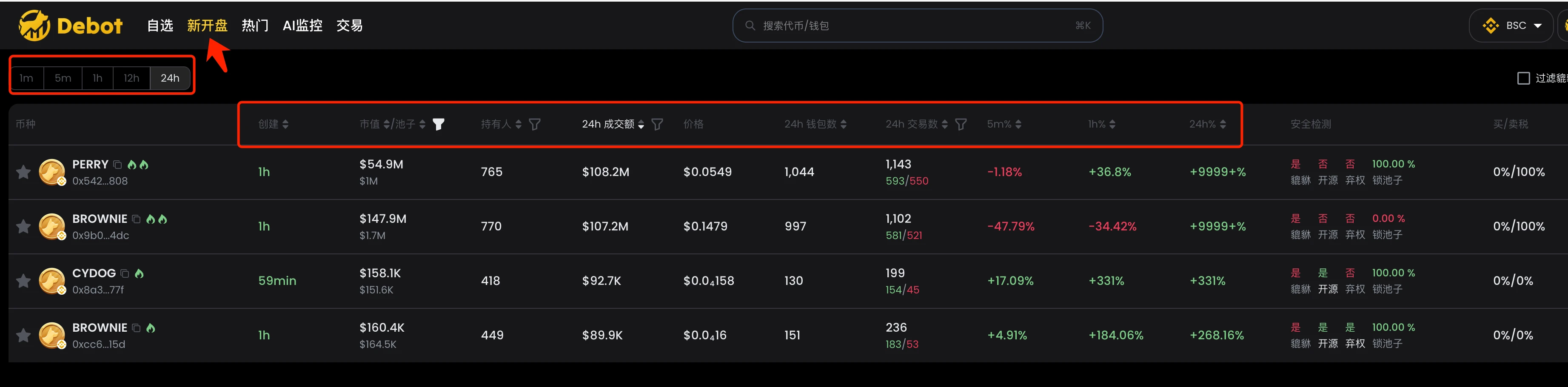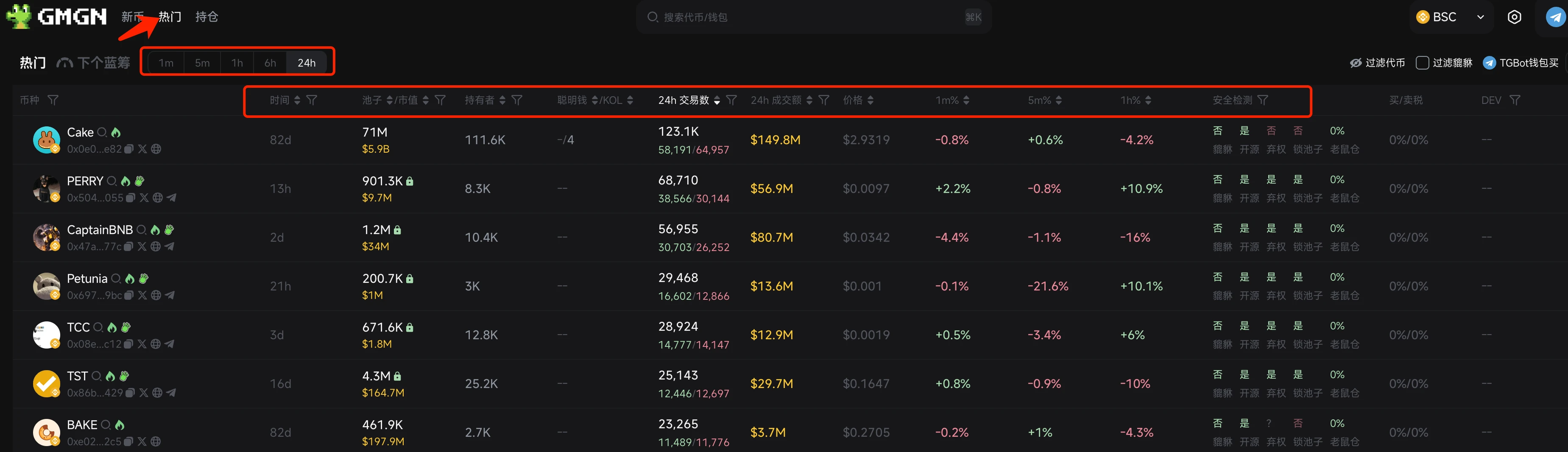 gmgn 前段时间刚支持 BSC 链,还被 cz 转发引用。 gmgn 的 BSC 链主要是【新币】和【热门】两个版块,和 debot 类似。
