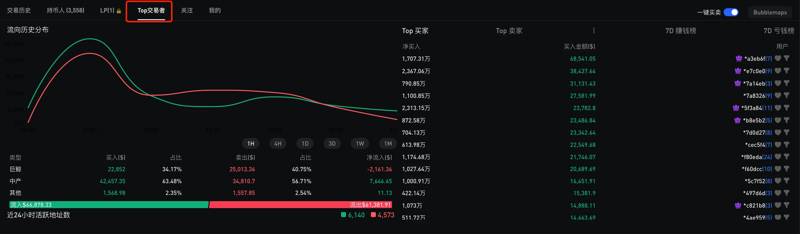 在 gmgn 中输入分析币的 CA,重要看最下面的【交易者】和【持有者】版块。
