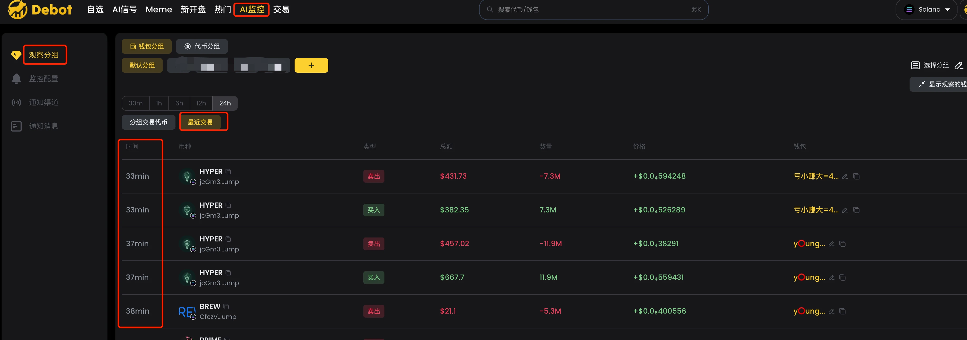 debot 监控导入聪明钱后,我们在【观察分组】中能按分组查看【分组交易代币】和【最近交易】。