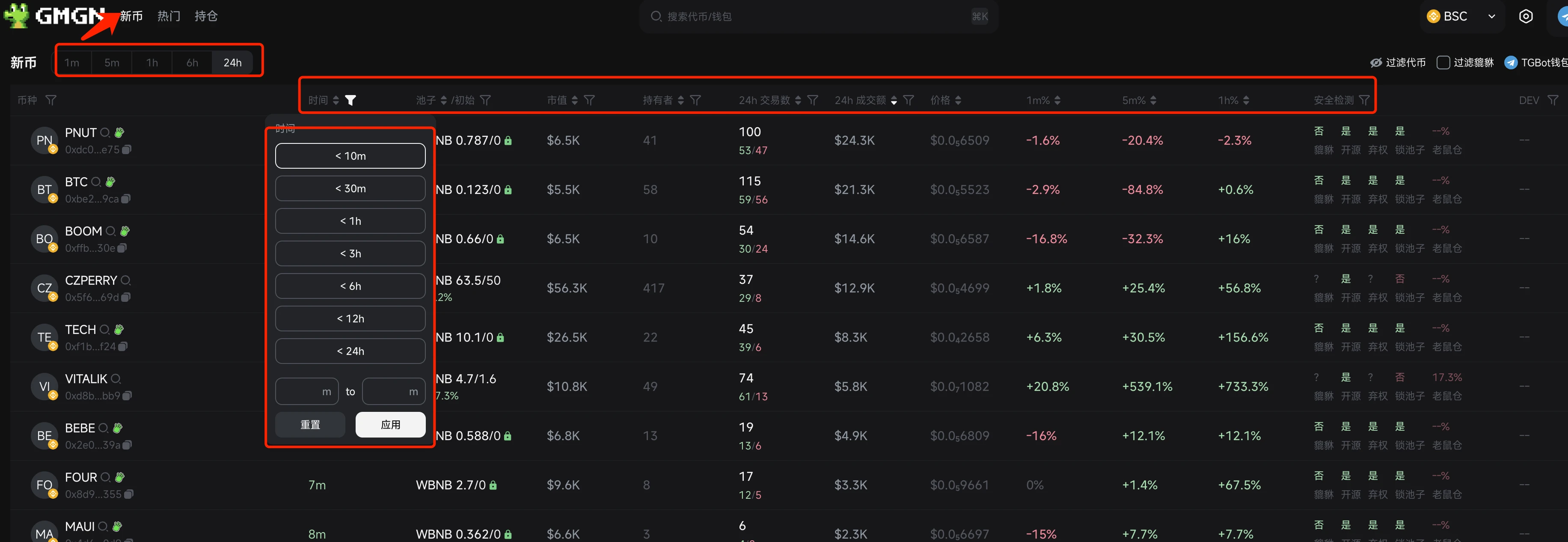 【新币】版块也是 24 小时内出来的新币,可以按时间筛选,粒度更细些;安全检测也支持筛选,EVM 上有些币刚开盘时不开源、不弃权、不锁池子都很常见,所以支持筛选确实很实用;其他的指标都是常见的,如图