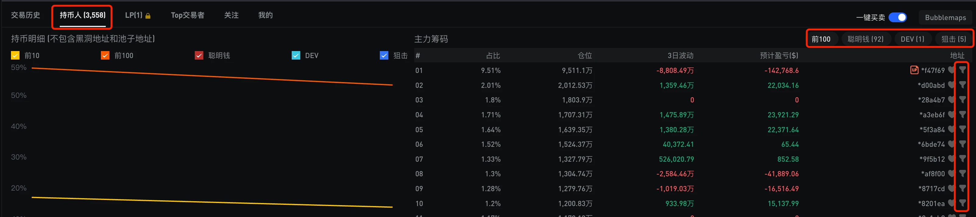 【持仓人】是 Top 100 持仓地址的列表,又分为“聪明钱”、“DEV”、“狙击”。