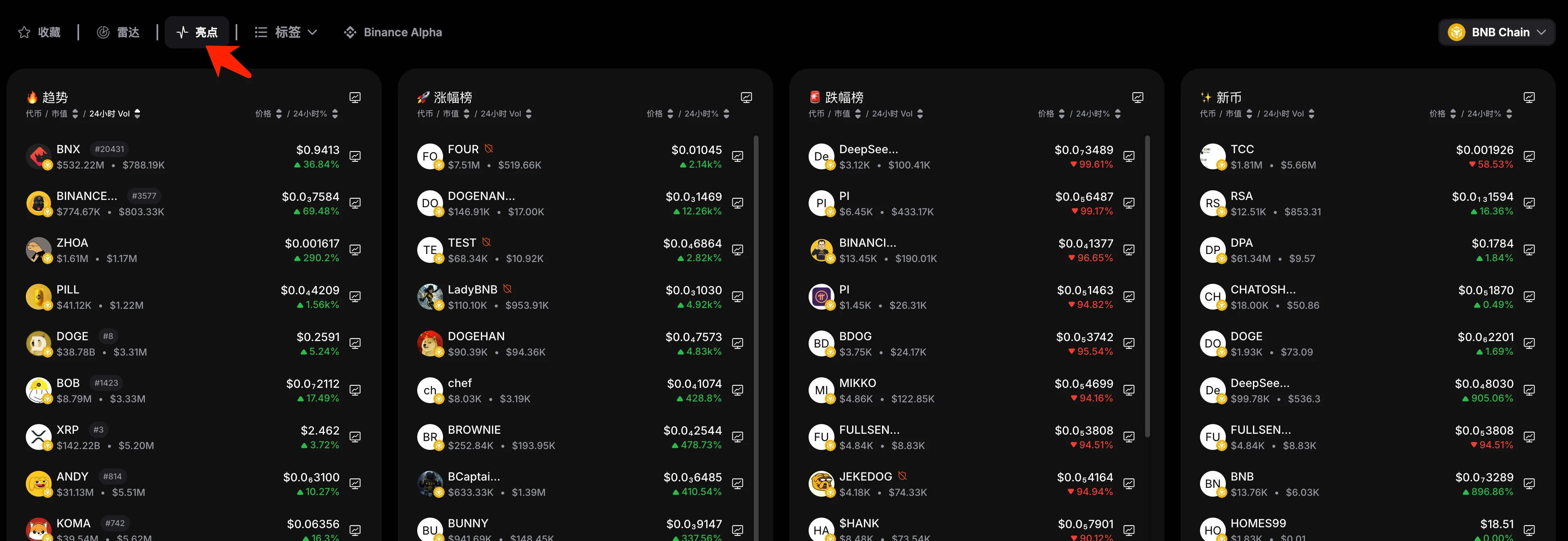 【亮点】功能做了 4 个榜单,包括“趋势”、“涨幅榜”、“跌幅榜”、“新币”。其中“趋势”、“涨幅榜”、和“新币”可以重点关注。