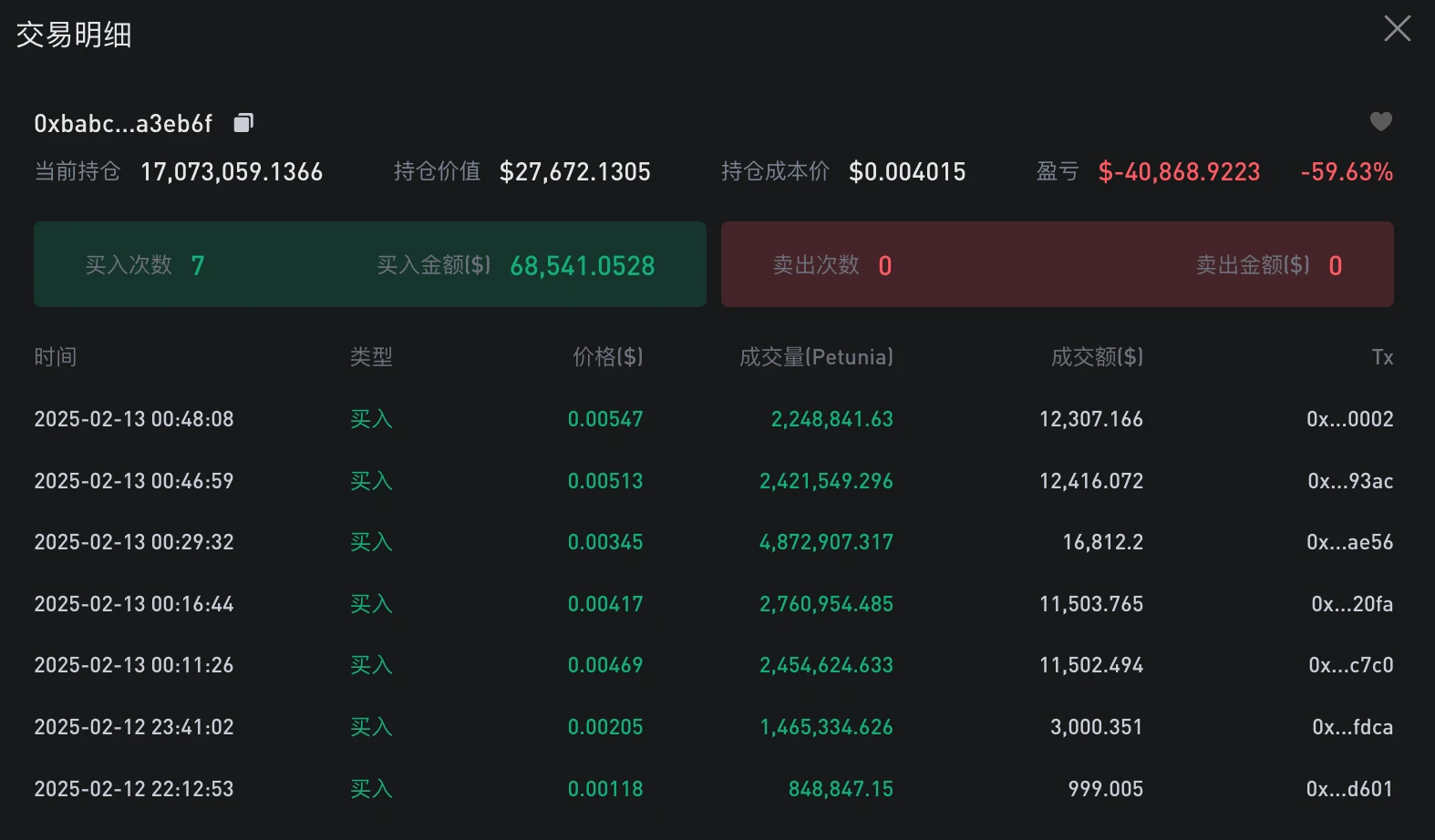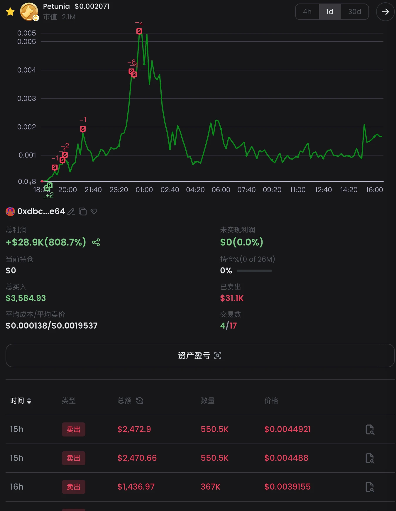 随便点一个地址,在界面的右侧会出现此地址的详细盈利数据和交易记录。